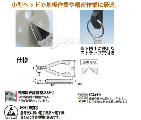 メーカー希望小売価格はメーカーサイトに基づいて掲載していますハサミ 鉄腕ハサミ GT エンジニア PH-55 はさみ 万能ハサミ 釣り キッチン TV商品番号:ENG-0106切れ味にもデザインにもこだわるプロのために。『切・剥・断・刃』特殊な素材も逃さずカット。ミッションは「最小で最強」ザ・プレミアム・シザーズマイクロニッパー NS-03 エンジニア ニッパー 工具 手芸 プラモデル ガンプラ おすすめ 道具商品番号:ENG-0292マイクロニッパー/小型サーキットボード周辺作業に最適です。マイクロニッパー ESD120mm エンジニア 静電気対策 グリップ 強力 精密 NS-04 電工用工具 おすすめ 道具商品番号:ENG-0293マイクロニッパー/小型ヘッドで細かい作業等に最適。マイクロニッパー 工具 NS-06 エンジニア ニッパー 工具 手芸 プラモデル ガンプラ おすすめ 道具商品番号:ENG-0294マイクロニッパー/小型ヘッドで細かい作業等に最適。/銅線等の柔らかい線材専用。チップカッター NZ-03 エンジニア 商品番号:ENG-0295チップカッター/垂直精密作業での細いワイヤー切断に最適です。チップカッター NZ-05 エンジニア 商品番号:ENG-0296チップカッター/刃先角度が45°になっており、密集区域での精密作業に最適です。4989833030858 ls@ENG-0291マイクロニッパー ゲートカット NP-05 エンジニア ニッパー 工具 手芸 プラモデル ガンプラ おすすめ 道具NP-05マイクロニッパー/ヘッドは小型で精密作業や細かな処理に適しています。/樹脂成形品のピンゲート処理等に最適です。刃部は入念な焼入れにより、切れ味鋭く耐久性も抜群です。刃部開き止め金具付です。静電気対策を施したESD対応グリップ採用(表面抵抗値:1×106~107Ω)ヘッドは小型で精密作業や細かな処理に適しています。樹脂成形品のピンゲート処理等に最適です。 問い合わせ品番:NP-05マイクロニッパー ゲートカット NP-05 エンジニア ニッパー 工具 手芸 プラモデル ガンプラ おすすめ 道具スペック全長(mm)123幅(mm)52先端幅(mm)11厚み(mm)11材質S58C刃部硬度HRC59±3切断能力(mm)銅線Φ0.8重量(g)65 エンジニア ※仕様及び外観は改善のため、予告なく変更することがあります。●engineer