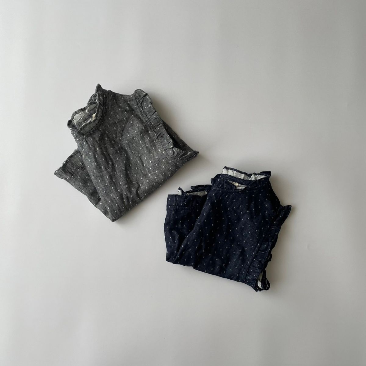 ・素材構成: 90%綿、10%麻 ・size: 80~130 ・color: navy / gray ・小さなブロックドットとフリルが可愛いトップス ・首回り、袖周り、裾にフリルが入っていて可愛いです ・後ろは全ボタンのデザインも可愛いです ・リネン混の素材で軽く涼しく着用できます ・ガーゼのような生地なので、洗濯により縮む可能性があります。お洗濯はネットに入れて行ってください。また、乾燥は推奨しておりません。 ・安心の満足度100%保証: 万が一不良品があった場合はもちろん、不良品でなくても「イメージと違ったな、なんか微妙だな」など、どのような理由でも満足して頂けなかった場合は、購入後30日間返品可能。返品送料も勿論頂きません ・ご注意: お客様のモニター環境により、実物と色味が違って見える場合がございます。ご了承くださいませ。また、海外製品のため検品基準が甘く、作りが甘いものがございます。全て海外では良品となっておりますので、当店でも着用に問題のないものは良品として発送させていただきます