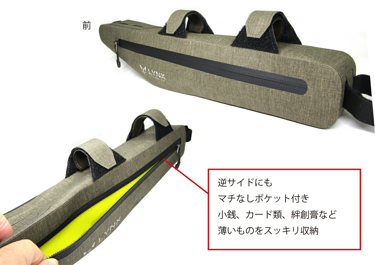 LYNX フレームインナーバッグ (M) LX216SJ JAN:4938402731344 ==商品サイズ== ■寸法 (最大値) 横:約430mm 縦:約90mm 奥行き:約60mm ■重さ 約163g ■フレーム固定型。内寸約400mmのロングサイズ ■ポンプや長めの工具等が収納しやすい。 ■モバイルバッテリー用のコード穴付き ■防水加工(完全防水ではございません) ■ウエルダー加工(熱圧着)による高い密閉性、防水性。 キャンプツーリング等をサポートする多彩なバリエーションをご用意。 ■止水ファスナー ■シックなカラーで上品で落ち着いた印象を与えます。 ■しっかりとした丈夫な生地で末永くご利用頂けます。 ■ポリエステル繊維を特殊加工し帆布のようなテクスチャーを再現。 ■キャンプツーリング等のアウトドアシーンにマッチする風合い。 ■縫い目を無くしたウェルダー加工(熱圧着)と止水ファスナーによる 高い密閉性、防水性。 ■統一感のあるデザイン、豊富なバリエーションで ユーザー毎に異なる多様な目的にも対応。