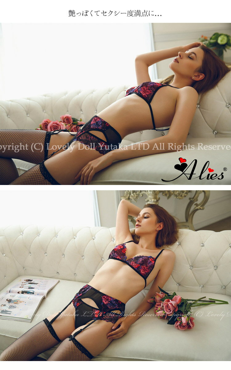 ラブリードール LovelyDoll ブラ&ショーツセット 大きいサイズ ルームウエア エロ セクシー ランジェリー セット 下着 オープンブラ 紐ブラ ヒモ ひもパン 紐パン クロッチレス レディース スケスケ レース ショーツ パンティ パンツ 透け かわいい Tバック Gストリング タンガ インポート 人気 過激 大人用 勝負下着 ホワイトデー プレゼント 新婚 お祝い<Alies>セクシーランジェリー 咲き誇る三角ブラ&ガーター Tバックセット 咲き誇る鮮やかなフラワー刺繍デザインがエレガントなブラ、ガーターベルト、ショーツのセット。 フロントもバックもぬかりなし! レースに浮かぶアートな刺繍がセクシーなランジェリーセットです。 ブラ・ショーツ・ガーターベルトの3点セット。 肩ストラップはバックで長さの調節が可能です。 サイズ目安:M〜Lサイズ