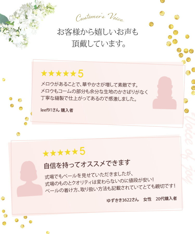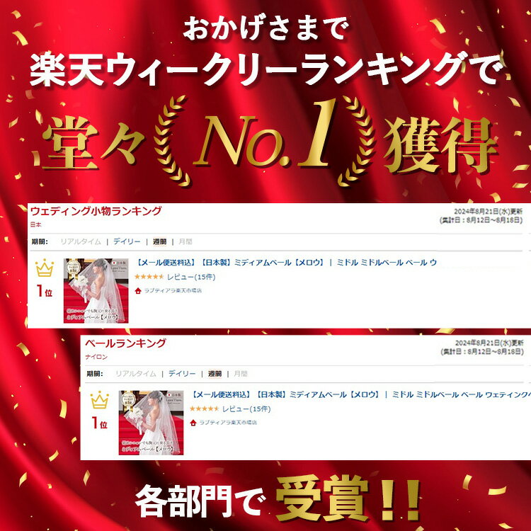 ご使用シーン 結婚式 挙式 海外挙式 披露宴 二次会 発表会 演奏会 金婚式 銀婚式 結婚祝い 快気祝い 就職祝い 出産祝い 卒業祝い お宮参り 初節句 慶事 お食い初め 百日祝い 母の日 父の日 お遊戯会 母親学級 産後ケア 七五三 成人式 卒業式 卒園式 入学式 入園式 ウェディング ウエディング ブライダル リゾート パーティー お呼ばれ 演出 イベント お祝い 礼服 スピーチ 余興 ジューンブライド 招待 招待状 前撮り 花嫁 親族 プチギフト 高砂 誓いの言葉 ブーケ ワード/用途 パール ジルコニア クリスタル ダイヤモンド シルバー ゴールド ブラック ローズ ピンクゴールド モチーフ リーフ スター 星 バレエ ネイル シンプル ゴージャス おしゃれ オシャレ お洒落 ジュエリー 高品質 オシャレ お洒落 インスタ 即日出荷 即日発送 即納 翌日配送可能 新品 格安 激安 通販 通信販売 購入 小物 アイテム 親族 衣装 マナー ヘアアレンジ コーディネート ママコーデ 引き出物 ラブティアラ商品一覧 ティアラ ドレス ヘッドドレス イヤリング ウェディングドレス ロングドレス リボンボンネ プリスリボン リボン シューズクリップ コーム リング ネックレス ベール ショートベール ミディアムベール ロングベール カチューシャ クラウン アクセサリー アクセ ヘアアクセ ヘアアクセサリー 髪飾り 小物 ブライダルヘア ピアスミディアム丈(ミドル丈)のウエディングベール(ヴェール)。 当店のヴェールはコームが薄く頭に挿し込みやすいオリジナル仕様です。 裾が波打つデザイン。 フェミニンで上品な花嫁スタイルに。 日本製。オフホワイト単色。 結婚式でベールダウンする時に胸の位置まで長さがあります。 ティアラやクラウンにも合わせやすい丈です。 素材 :チュール、コーム サイズ :前80cm、後ろ100cm、横幅約188cm カラー:オフホワイト 仕様 :コーム付き 付属:専用バッグ付き
