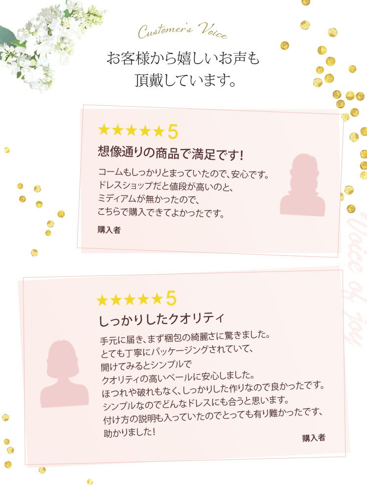 ご使用シーン 結婚式 挙式 海外挙式 披露宴 二次会 発表会 演奏会 金婚式 銀婚式 結婚祝い 快気祝い 就職祝い 出産祝い 卒業祝い お宮参り 初節句 慶事 お食い初め 百日祝い 母の日 父の日 お遊戯会 母親学級 産後ケア 七五三 成人式 卒業式 卒園式 入学式 入園式 ウェディング ウエディング ブライダル リゾート パーティー お呼ばれ 演出 イベント お祝い 礼服 スピーチ 余興 ジューンブライド 招待 招待状 前撮り 花嫁 親族 プチギフト 高砂 誓いの言葉 ブーケ ワード/用途 パール ジルコニア クリスタル ダイヤモンド シルバー ゴールド ブラック ローズ ピンクゴールド モチーフ リーフ スター 星 バレエ ネイル シンプル ゴージャス おしゃれ オシャレ お洒落 ジュエリー 高品質 オシャレ お洒落 インスタ 即日出荷 即日発送 即納 翌日配送可能 新品 格安 激安 通販 通信販売 購入 小物 アイテム 親族 衣装 マナー ヘアアレンジ コーディネート ママコーデ 引き出物 ラブティアラ商品一覧 ティアラ ドレス ヘッドドレス イヤリング ウェディングドレス ロングドレス リボンボンネ プリスリボン リボン シューズクリップ コーム リング ネックレス ベール ショートベール ミディアムベール ロングベール カチューシャ クラウン アクセサリー アクセ ヘアアクセ ヘアアクセサリー 髪飾り 小物 ブライダルヘア ピアスミディアム丈(ミドル丈)のウエディングベール(ヴェール)。 当店のヴェールはコームが薄く頭に挿し込みやすいオリジナル仕様です。 シンプルな切りっぱなしデザイン。 お気に入りのドレスやアクセサリーをより美しく魅せる花嫁スタイルに。 日本製。オフホワイト単色。 低めのまとめ髪の上に着用しても 結婚式でベールダウンする時に胸の位置まで長さがあります。 ティアラやクラウンにも合わせやすい丈です。 【ドラマ『しあわな結婚』協賛】 素材 :チュール、コーム サイズ :前80cm、後ろ100cm、横幅約188cm カラー:オフホワイト 仕様 :コーム付き 付属:専用バッグ付き
