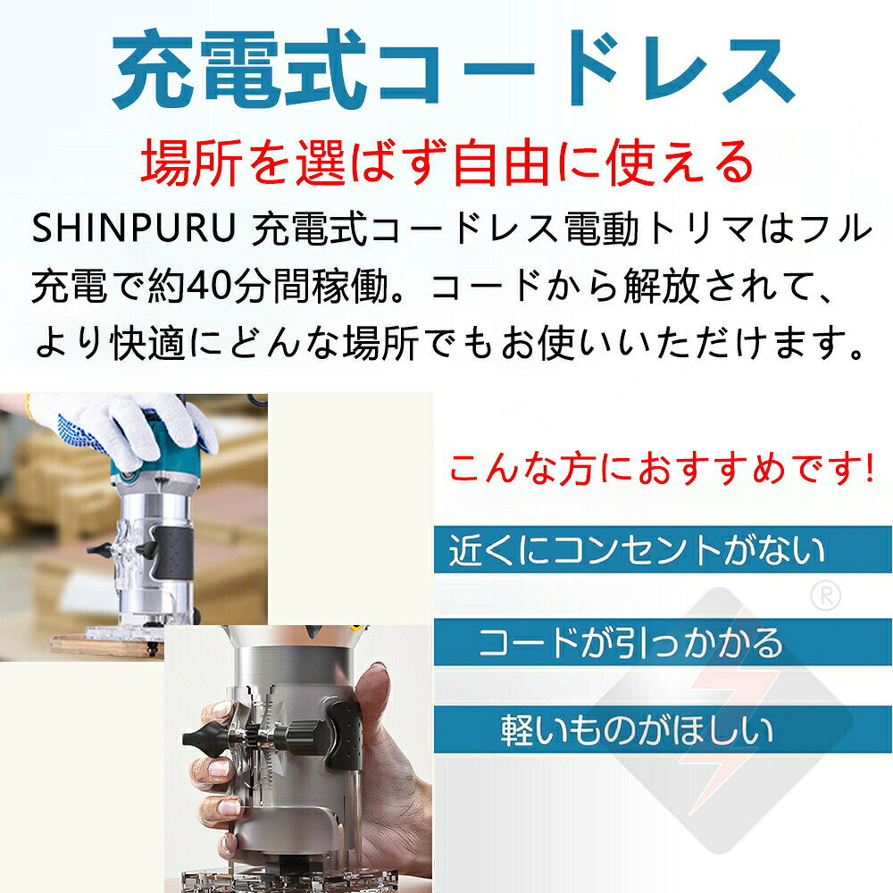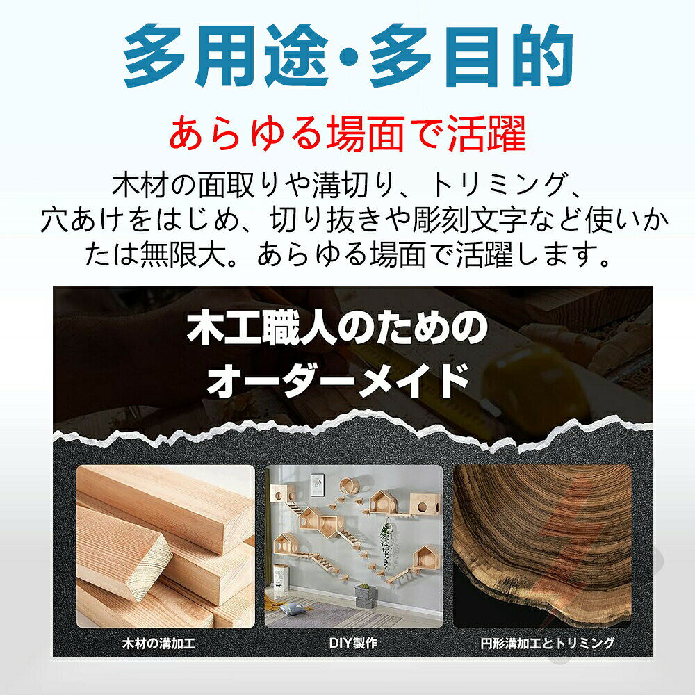充電式トリマ 電動トリマー 電動ルーター コンパクト軽量 軸径6mm ブラシレスモーターを搭載 日本規格 6段階変速 木材の面取りや溝切り用 木工用トリマー トリマー本体 穴あけ 切断 彫刻 研磨木材溝切り用電動ルーター 6段階変速 木材の面取りや溝切り用 電動工具 穴あけ/切断/彫刻/研磨木材溝切り用【本体のみ】電動トリマーとは、先端に取り付けた高速回転する刃によって、様々な切削加工ができる電動工具です。先端の刃はビットと呼ばれており、ビットを交換することで飾り掘りや溝加工などを楽しむことが可能。尖った角を面取りできるし、さまざまな形の溝(みぞ)が掘れる、文字の彫刻や切り抜きも簡単片手できます。軽量なので、力の弱い女性でも簡単に扱えます。誰が使用してもプロ顔負けの仕上がりになるのがうれしいでしょうか。【ABS透明ベース】ビットや作業の状態を目視で確認できる便利な透明ベースを装備しました。【スケール付き】感覚ではなく数値で管理できるため正確に作業をすすめることができます。【ゴムカバー付きハンドル】滑りにくく、握りやすくなりました。長時間作業でも疲れにくい。【幅広い機能】電気トリマーはトリミングだけでなく、木材の面取りや溝切り、穴あけなどを行う、切り抜きや彫刻文字、木製ドア加工工場、家具工場、DIY家の装飾、ならい加工等に幅広く適用します。5【仕様】メインカラー: ブルー+ブラック材質:プラスチック+金属電力: 600W速度: 最大。 18000rpmトリム直径: 6.35mm (1/4インチ)バッテリー: 10*3.7V、3000mAhパッケージサイズ: 341*135*107 ミリメートル/13.4*5.3*4.2 インチパッケージの重量: 2000g/4.4ポンド【6段階変速可能】電動トリマーは刃物を回転させながら削り取る工具です。弊社の電動トリマーは6段階変速の機能を備えており、木材の硬度により適切な回転数は変わります。力の弱い女性でも簡単に扱えます。始動時に、一番低い段階にして、激しく揺れることも防止します。面取りとは木材の表面をなめらかに削って、木材を美しく仕上げることに大活躍しています。【ブラシレスモーターを搭載】ブラシレスモーターは、整流子やブラシなどの機械的な接触部を取り除いたモーターです。ブラシレスモーターのメリットは放熱性良い、ハイパワー、静音化、長寿命化です。弊社の電動式トリマーはブラシレスモータを搭載しておりますので、機器の性能は大きく高めます。【コードレス式なので作業しやすく!】充電式の電動トリマーはコードがないのでどこでも持ち運べるのは便利です。コンセントがない場所でも問題なく使用できます。作業中にコードが邪魔になってしまう心配もありません。いつでも好きな場所へどこにでも持ち運んで使うことができます。【透明ベース】透明で調節可能な基盤を使うと、操作の正確さをして便利さを達成する為に切断トラックは直接観察することができます。樹脂ベースを採用して、刃先が見やすい。作業がしやくなります。【適用範囲が広い】木材の面取りや溝切り、トリミング、穴あけなどを行う、切り抜きや彫刻文字、ならい加工等に幅広く対応できます。尖った角を面取りできるし、さまざまな形の溝(みぞ)が掘れる、文字の彫刻や切り抜きも簡単片手できます。【チャックの組み立て】Step1:2枚レンチを使ってネジ山続き口に固定してからチャックを緩めます。Step2:インナーチャックとガスケットを外します。Step3:ドリルビットをチャックとガスケットに通します。Step4:チャックをしっかりとねじ込みます。 完成します。充電式トリマ 電動トリマー 電動ルーター コンパクト軽量 軸径6mm ブラシレスモーターを搭載 日本規格 6段階変速 木材の面取りや溝切り用 木工用トリマー トリマー本体 穴あけ 切断 彫刻 研磨木材溝切り用電動ルーター 6段階変速 木材の面取りや溝切り用 電動工具 穴あけ/切断/彫刻/研磨木材溝切り用【本体のみ】電動トリマーとは、先端に取り付けた高速回転する刃によって、様々な切削加工ができる電動工具です。先端の刃はビットと呼ばれており、ビットを交換することで飾り掘りや溝加工などを楽しむことが可能。尖った角を面取りできるし、さまざまな形の溝(みぞ)が掘れる、文字の彫刻や切り抜きも簡単片手できます。軽量なので、力の弱い女性でも簡単に扱えます。誰が使用してもプロ顔負けの仕上がりになるのがうれしいでしょうか。【ABS透明ベース】ビットや作業の状態を目視で確認できる便利な透明ベースを装備しました。【スケール付き】感覚ではなく数値で管理できるため正確に作業をすすめることができます。【ゴムカバー付きハンドル】滑りにくく、握りやすくなりました。長時間作業でも疲れにくい。【幅広い機能】電気トリマーはトリミングだけでなく、木材の面取りや溝切り、穴あけなどを行う、切り抜きや彫刻文字、木製ドア加工工場、家具工場、DIY家の装飾、ならい加工等に幅広く適用します。5【仕様】メインカラー: ブルー+ブラック材質:プラスチッ