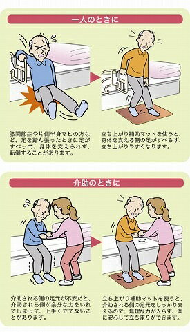 【商品説明】 ・1人での立ち上がりをサポート。介助のときにも便利です。 ・介助を受ける側の足もとを安定させるのでスムーズな介助ができます。 ・特殊発泡素材で足もとの滑りを防止。 ・病院や施設の床、ご家庭のフローリング、じゅうたん、畳に置くだけの簡単設置。 ※変形・色落ち・変色などの恐れがあるため、床暖房対応は避けてください。 【仕 様】 ●サイズ/幅38×奥行28×厚さ0.4cm ●重さ/約0.6kg ●材質/オレフィン系エラストマー、合成ゴム ●生産国/日本
