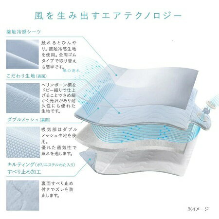 【商品説明】 ・マットの中に風を通して蒸れを軽減。 ・マット内に風が流れて、蒸れにくい心地よさへ。 ・湿気をしっかり排出。排出ファンを側面に持ってくることで、掛け布団がかぶさりにくくマット面も広々使えます。 ・ファンを取り外すと全て洗えます。本体カバーは洗濯機で、3次元ファイバーは水で洗えます。 【仕 様】 ●サイズ/幅110×長さ100×高さ6cm ●重さ/約2.5kg ●材質/表地:ポリエステル50%・綿50%、中材:POE100%、裏地:ポリエステル85%・綿15% ●電源/AC100V ●消費電力/2.6W ●生産国/中国 ●洗濯機可(付属カバーのみ) ●脱水機可(付属カバーのみ) ●乾燥機可(付属カバーのみ)