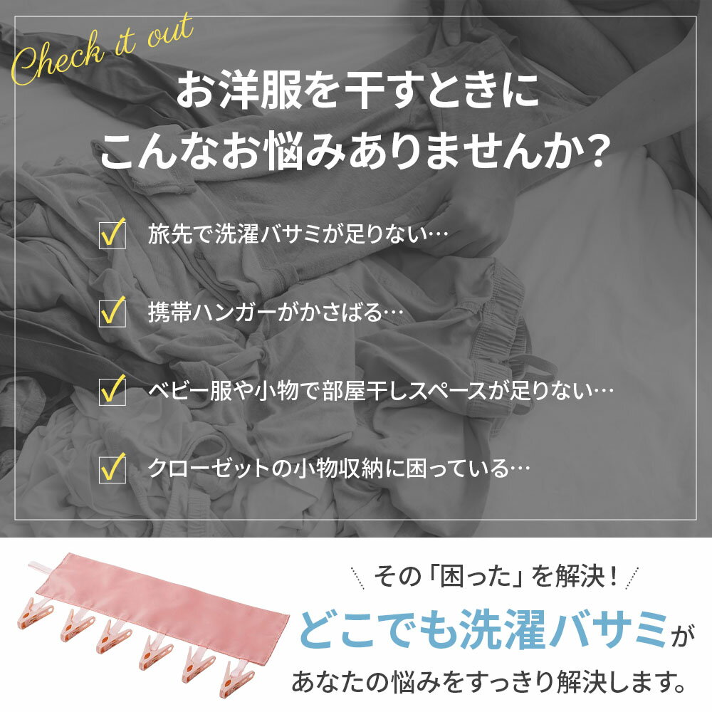 【商品概要】 ・旅行や出張でも便利な超軽量・コンパクトな洗濯バサミセット ・6連ピンチでミニタオルや靴下などをまとめて干せる ・マジックテープで簡単に取り付け、ほとんどのハンガーに適用 ・お得な2個セットで用途が広がる ポイント◎超軽量&省スペース 約36gの軽さで携帯にも最適 トランクやバッグにすっきり収納可能 限られたスペースでも効率よく干せる設計 ポイント◎こだわりの品質とデザイン 丈夫なPP素材に布張りの上品な仕上げ 滑りにくい6連クリップで安心 暮らしに馴染むおしゃれな4カラー展開 【こんなシーンで活躍!】 旅行や出張、室内干し、アウトドアなど幅広く使用可能 【商品仕様】 ・サイズ:約33cm × 10cm ・重量:約36g(1個あたり) ・素材:商品本体PP、表面布ポリエステル ・セット内容:同色2個セット ・カラー:ミストブルー、コーラルピンク、ライトグレー、フォグチェック 【注意事項】 ・直径3.3cm未満のバーには取り付けできません ・火気の近くでは使用しないでください ・強風時の屋外使用は控えてください ・色褪せを防ぐため直射日光を避けて保管してください ・小さなお子様の手の届かない場所で保管してください