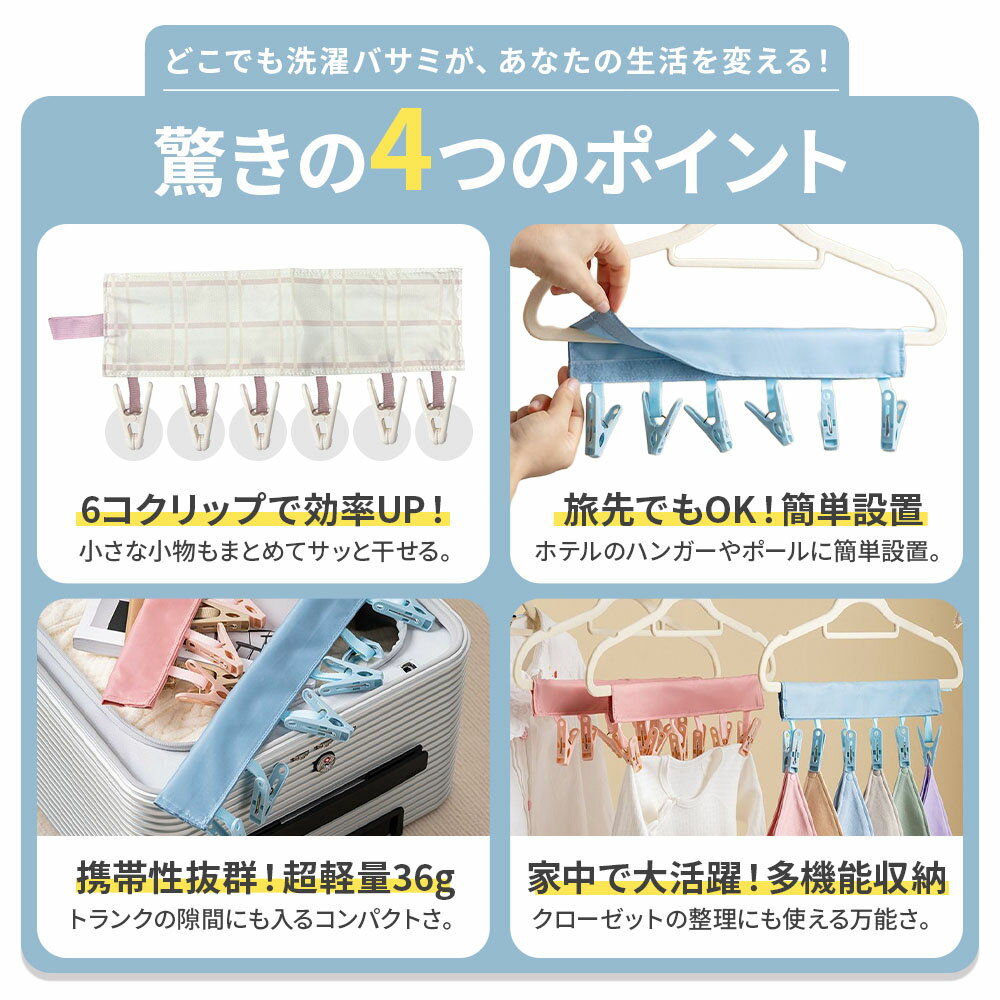 【オープンSALE価格!】どこでも干せる 洗濯バサミ 2個セット 6連 カラフル 出張 旅行 ハンガー 取り付け ポータブル 物干し 持ち運び 洗濯ばさみ ベビー用品 洗濯小物 靴下干し ハンガー拡張 省スペース セット商品
