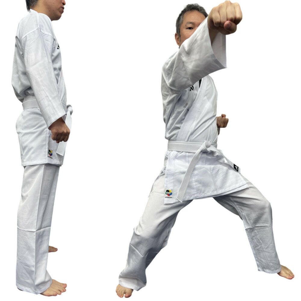 初心者向けの練習用空手衣WKF公認空手衣(上下セット)軽くて動きやすい空手着かなり薄い生地となっております。速乾素材、一部メッシュ素材白帯付きレギュラーフィット身長より5センチ程度大き目がお勧めです(個人差あります)*身長145センチの方は150センチ*身長150センチの方は160センチ速乾素材で、乾きやすいです。上衣の脇とズボン股が一部メッシュ—素材になっております。プリントロゴズボンにもロゴがあるため全空連公式大会で使用できません。素材ポリエステル100%ズボンはゴムバンドタイプ(紐あり)原産国パキスタン 新モデルになって空手着のサイズが変わりました。