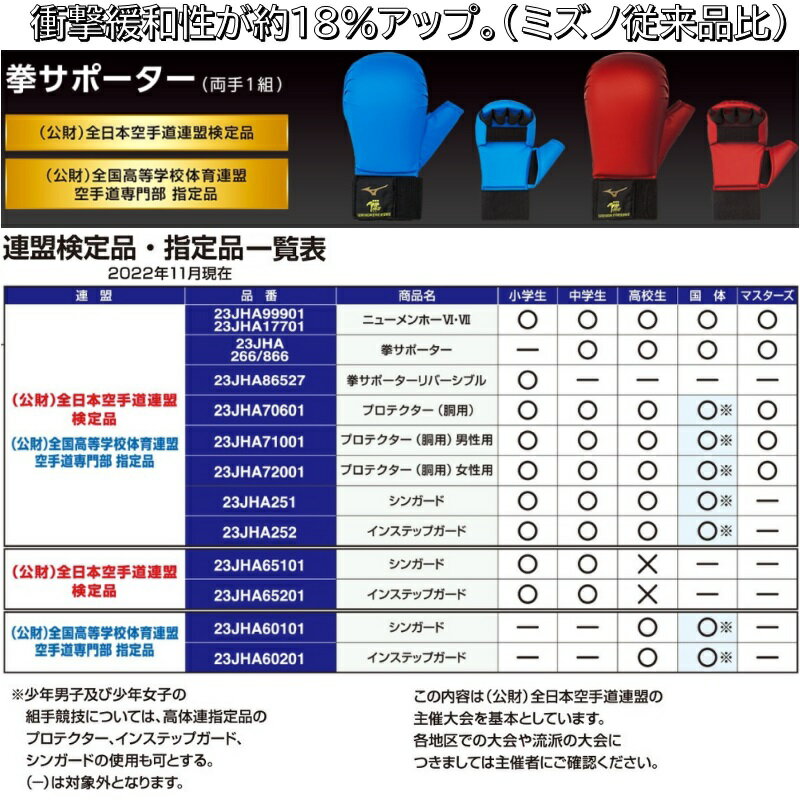 NEWモデル ミズノ 空手 拳サポーター 赤 青 2個セット ノンコンタクト用 寸止め用・衝撃緩和性が約18%アップ・ロゴカラーをゴールドに変更し、より重厚感のある織ネーム(刺繍)になりました。全日本空手選手権・国体・インターハイ・全国中学校高校選抜・マスターズ使用(公財)全日本空手道連盟検定品(公財)全国高校体育連盟空手道専門部指定品材質表地:PUレザー中身:PUフォーム、EVAフォームベルト:ゴムカラーブルー(23JHA26627)レッド(23JHA26662)サイズSS、S、M、L、LL【特徴】メンホー着用の試合にも対応するように親指部カバーを装備しています。指止めゴムが4箇所に分かれておりより操作性、安全性、フィット性に優れています。手首にベロクロテープを使用し、着脱が簡単です。※本製品はノンコンタクト(寸止め)用です。コンタクト用としては絶対に使用しないでください[23JHA266]【検索ワード】>空手 グローブ グラブ 拳サポ 手袋 サポーター ハンドガード 格闘技 カラテ 空手道 空手用 カラテ用 空手道用 KARATE パンチンググローブ 伝統 伝統派 寸止め すん止め ノンコンタクト 大人用 一般用 子供用 キッズ用 少年用 小学生用 ジュニア用 Jr用 ユース用 少女用 12歳以下 男の子用 女の子用 子ども用 こども用 全日本空手道連盟検定品 JKF公認 全空連NEWモデル ミズノ 空手 拳サポーター 赤 青 2個セット ノンコンタクト用 寸止め用・衝撃緩和性が約18%アップ・ロゴカラーをゴールドに変更し、より重厚感のある織ネーム(刺繍)になりました。全日本空手選手権・国体・インターハイ・全国中学校高校選抜・マスターズ使用(公財)全日本空手道連盟検定品(公財)全国高校体育連盟空手道専門部指定品材質表地:PUレザー中身:PUフォーム、EVAフォームベルト:ゴムカラーブルー(23JHA26627)レッド(23JHA26662)サイズSS、S、M、L、LL【特徴】メンホー着用の試合にも対応するように親指部カバーを装備しています。指止めゴムが4箇所に分かれておりより操作性、安全性、フィット性に優れています。手首にベロクロテープを使用し、着脱が簡単です。※本製品はノンコンタクト(寸止め)用です。コンタクト用としては絶対に使用しないでください[23JHA266]空手 グローブ グラブ 拳サポ 手袋 サポーター ハンドガード 格闘技 カラテ 空手道 空手用 カラテ用 空手道用 KARATE パンチンググローブ 伝統 伝統派 寸止め すん止め ノンコンタクト 大人用 一般用 子供用 キッズ用 少年用 小学生用 ジュニア用 Jr用 ユース用 少女用 12歳以下 男の子用 女の子用 子ども用 こども用