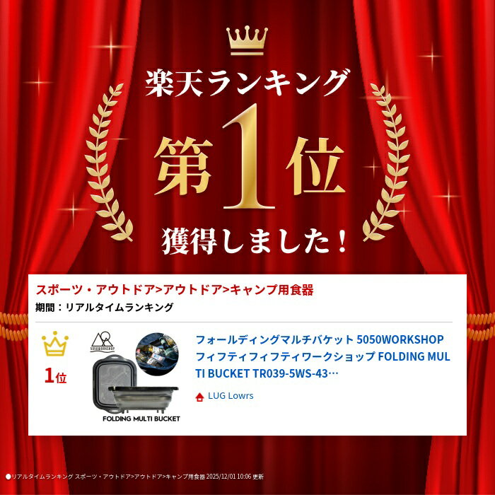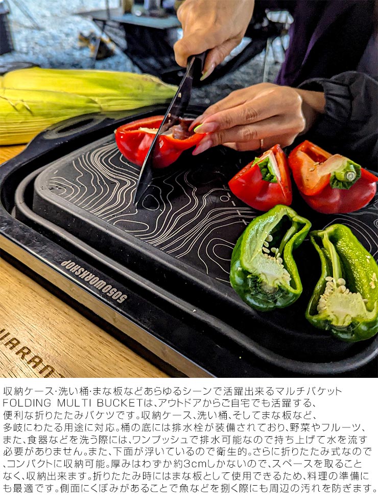 5050WORKSHOP 「 FOLDING MULTI BUCKET 」 TR039-5WS-4377 収納ケース・洗い桶・まな板などあらゆるシーンで活躍出来るマルチバケット FOLDING MULTI BUCKETは、アウトドアからご自宅でも活躍する、便利な折りたたみバケツです。 収納ケース、洗い桶、そしてまな板など、多岐にわたる用途に対応。 桶の底には排水栓が装備されており、野菜やフルーツ、また、食器などを洗う際には、ワンプッシュで排水可能なので持ち上げて水を流す必要がありません。 また、下面が浮いているので衛生的。さらに折りたたみ式なので、コンパクトに収納可能。 厚みはわずか約3cmしかないので、スペースを取ることなく、収納出来ます。 折りたたみ時にはまな板として使用できるため、料理の準備にも最適です。側面にくぼみがあることで魚などを捌く際にも周辺の汚れを防ぎます。 ※FOLDING MULTI BUCKETの底面についている排水用の栓は、完全に止水する仕様にはなっておりませんので、 水を溜めて使用する際は必ずシンクなどの水回りでご使用頂きますようお願いいたします。 サイズ・容量 ・サイズ:約400×298×132mm ・折りたたみサイズ:約400×298×28mm ・重量:約425g ■生産地:中国 ■素材・成分:・材質:PP(ボード・レーザー刻印部) 栓(TPE) 伸縮部(TPR) ■パッケージ:個別箱 ※お使いのモニターや機種によって、色の見え方が掲載の写真と異なる場合がございます。 ※ブランドまたはアイテムにより、表記のサイズに若干の差がある場合がございます。 ※販売価格は入荷の時期によって変動する場合があります。予めご了承下さいませ。 ※店頭や他サイトでも販売しておりますので、随時在庫が変動しております。 ご注文が確定しても、タイミングによっては商品がご用意出来ない場合がございます。 #5050WORKSHOP #フィフティフィフティワークショップ #LED #CAMP #OUTDOOR #GOOUT #SURF #SKATE #BBQ #アウトドア #バケツ #フェス #キャンプ #バーベキュー #メンズ #レディース #サーフブランド #サーフィン #海 #ビーチ #ヨガ #ゴルフ #フィットネス #レジャー #ピクニック #ゆるキャン #旅行 #登山 #トレッキング
