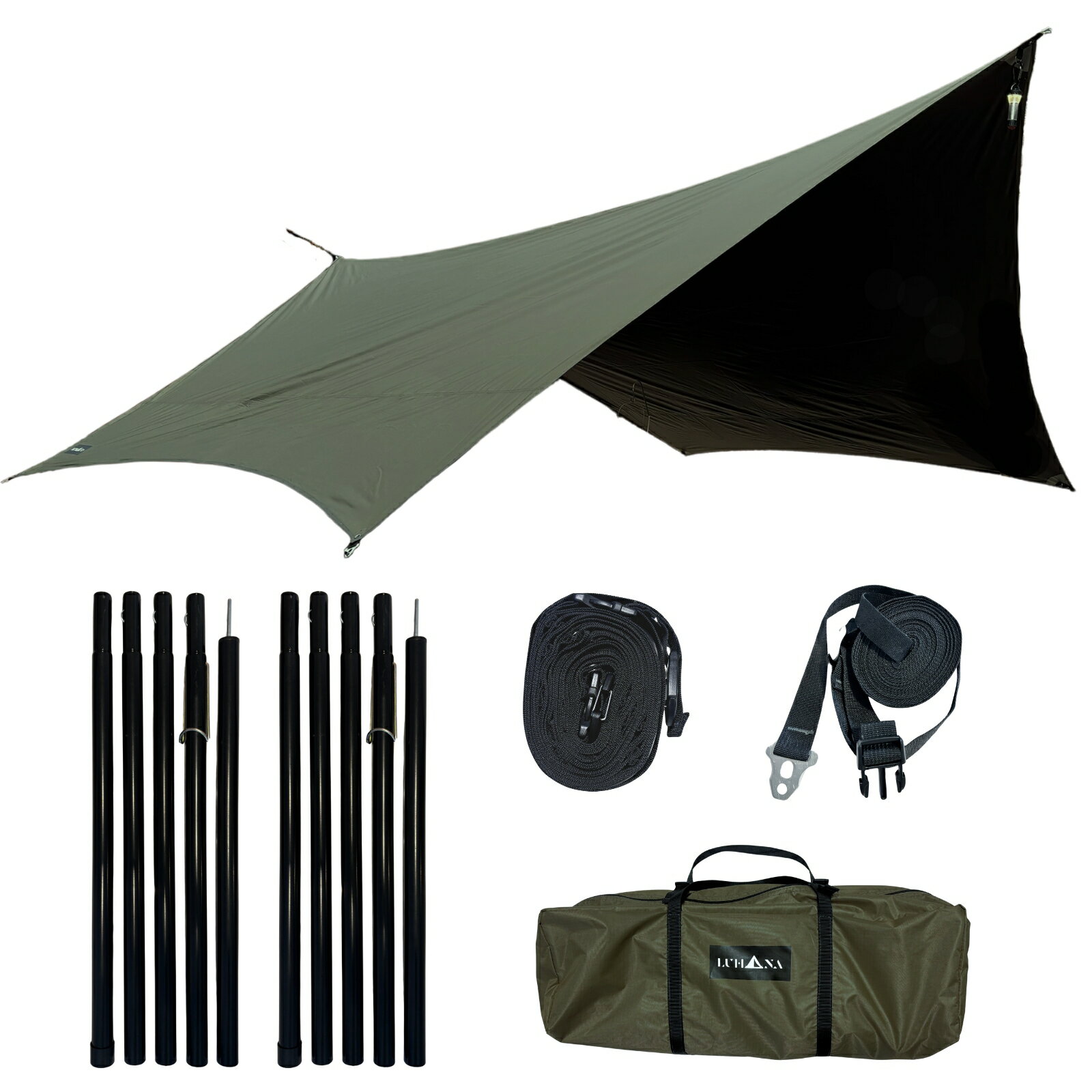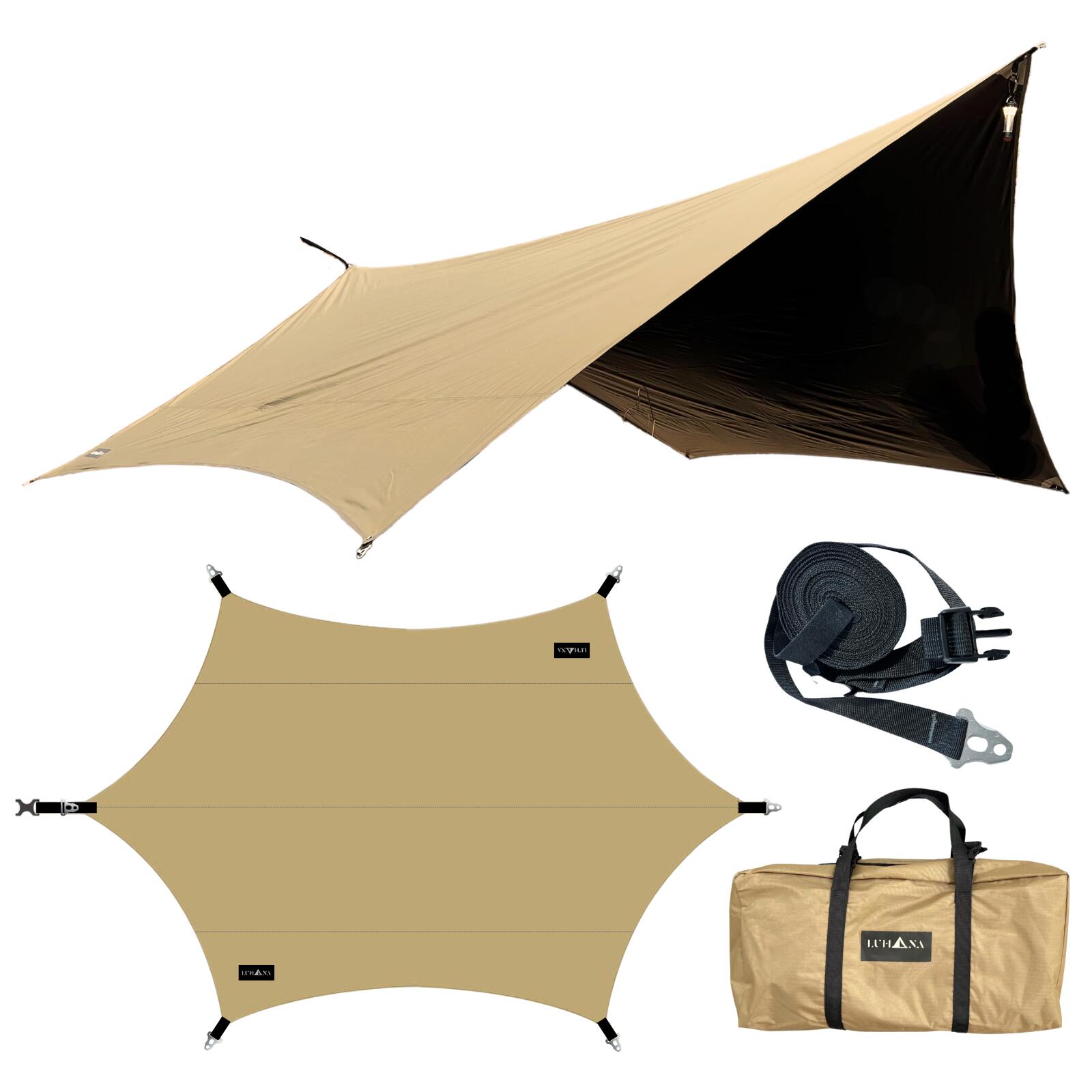 LUHANA タープ ヘキサタープ 難燃性 ポリエステル 耐水圧8000mm ブラックコーティング 遮光 大型 5m延長ベルト付き 軽量 420×410cm