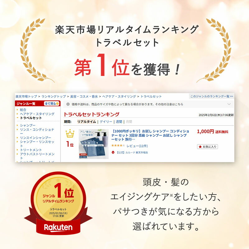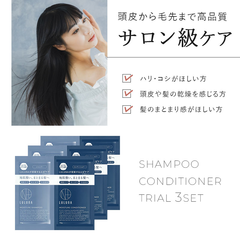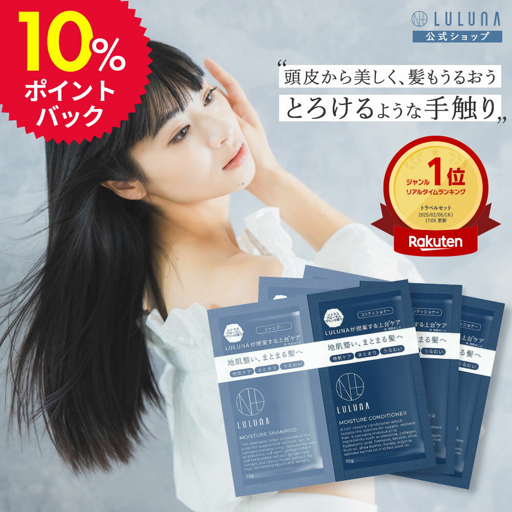 購入した人のレビュー ★★★★★5 タラオ8083さん 女性 40代 シャンプー解析で評価が高かったので試してみたのですが、抜け毛が減り使用感もよかったので定期購入したいと思います。 2025/10/28 ★★★★★5 購入者さん 配送早かったです。とっても、いい匂いでした。髪の毛もサラサラです。家族にも好評。2025/07/16 ★★★★★5 ななながせさん 女性 30代 ルルーナさまの、シャンプー、モイスチャー。購入させて頂きました。パサつきが落ち着き、しっとりとして今までに買ったシャンプーの中で一番良かったように思います。2025/01/18 商品情報商品名お試しモイスチャーシャンプー&コンディショナー 3セット内容量10g×各3枚(3回分)広告文責株式会社ルルーナ03-5244-9282(平日9:00-17:00)メーカーLULUNA(ルルーナ)生産国日本原材料・成分【シャンプー】水、ラウラミドプロピルベタイン、ラウロイルアスパラギン酸Na、コカミドメチルMEA、ココイルグルタミン酸TEA、サッカロミセス/(黒砂糖/プラセンタエキス)発酵液、水溶性コラーゲン、サッカロミセス/(パイナップル果汁/コラーゲン)発酵液、セレブロシド、ココイル加水分解ケラチンK(羊毛)、ヒト毛根細胞順化培養液、 加水分解アナツバメ 巣エキス、 プラセンタエキス、加水分解ウマ羊膜エキス、ヒトオリゴペプチド-1、ヒトオリゴペプチド-13、 ヒトオリゴペプチド-5、加水分解ケラチン(羊毛)、バンブサアルンジナセア葉エキス、カワラタケエキス、乳酸桿菌/ダイコン根発酵液、アセチルテトラペプチド-3、アカツメクサ花エキス、アセトバクター/イチョウ葉発酵エキス、シゾサッカロミセス/イチジク果実発酵液、ショウガ根エキス、ポリソルベート20、ヤシ油脂肪酸PEG-7グリセリル、ポリクオタニウム-7、ポリクオタニウム-10、デキストラン、キサンタンガム、カ ラメル、塩化Na、クエン酸、BG、DPG、グリセリン、ペンチレングリコール、EDTA-2Na、フェノキシエタノール、香料【コンディショナー】水 、 セテアリルアルコール 、 グリセリン 、 ジメチコン 、 シクロペンタシロキサン 、 ステアルトリモニウムクロリド 、 オリーブ果実油 、 シア脂 、 アルガニアスピノサ核油 、 チャ種子油 、 コメ発酵液 、 ピロリジニルジアミノピリミジンオキシド 、 加水分解アナツバメ巣エキス 、 プラセンタエキス 、 プラセンタ脂質 、 加水分解ウマ羊膜エキス 、 加水分解ケラチン(羊毛 )、 バンブサアルンジナセア葉エキス 、 カワラタケエキス 、 乳酸桿菌/ダイコン根発酵 液 、 ヒトオリゴペプチド-1 、 ヒトオリゴペプチド-5 、 ヒトオリゴペプチド-13 、 サッカロミセス/(黒砂糖/プラセンタエキス)発酵液 、 サッカロミセス/(パイナップル果汁/コラーゲン)発酵液 、 アセチルテトラペプチド-3 、 アカツメクサ花エキス 、 ヘマチン 、 アセトバクター/イチョウ葉発酵エキス 、 シゾサッカロミセス/イチジク果実発酵液 、 ショウガ根エキス 、 水溶性コラーゲン 、 セレブロシド 、 ハチミツ 、ベタイン 、 マルチトール 、 ヒアルロン酸ヒドロキシプロピルトリモニウム 、 キトサンステアラミドヒドロキシプロピルトリモニウムクロリド 、 トコフェロール 、 ポリクオタニウム-33 、 エチルヘキシルグリセリン 、 PEG-90M 、 カラメル 、 グアーヒドロキシプロピルトリモニウムクロリド 、 ジココジモニウムクロリド 、 ジメチコノール 、 アモジメチコン 、 ビスセテアリルアモジメチコン 、 セテス-20 、 キサンタンガム 、 ヒドロキシエチルセルロース 、デキストラン 、 BG 、 乳酸 、 エタノール 、 フェノキシエタノール 、 香料商品区分化粧品キーワードお試し トラベルセット 旅行用 シャンプー アミノ酸シャンプー ノンシリコンシャンプー コンディショナー シャンプーコンディショナーセット 20代 30代 40代 50代 60代 品質 しっとり 補修 ツヤ 髪質 兼用 ユニセックス 香り 良いにおい 良い香り シトラス フローラル ムスク ダメージヘア くせ毛 うねり 湿気 紫外線 乾燥 パサつき ごわつき 広がり 使い切り 送料無料 送料込み 頭皮 フケ 黒髪 エイジング うねり 地肌 送料無料 オススメ 敏感肌 乾燥肌 乾燥 肌 日本製 おしゃれ サロン品質 保湿除外キーワード※以下を目的としておりませんサロン専売品 ノンケミカル 美容室専売品\楽天1位&1000円ポッキリ/ エイジングケア お試し3回分 モイスチャーシャンプー&コンディショナー トライアルセット エイジングケア シャンプー お試し 頭皮に優しい シャンプー お試し パウチ シャンプー 使い切り パウチ シャンプー お試し 頭皮ケア シャンプー 低刺激 シャンプー 頭皮 スッキリ シャンプー 頭皮 べたつき シャンプー 髪 広がり 抑える トリートメント くせ毛 パサつき シャンプー 弱酸性 アミノ酸系 ヒト毛根順化培養液配合 \当店大人気のモイスチャーシャンプー&コンディショナーを、まずはお試ししたい方にオススメ/「目指すのは、サロン帰りの指どおり」しなやかで やわらかな地肌に、毛先までまとまるさらツヤ髪。それを叶えるのは、スキン