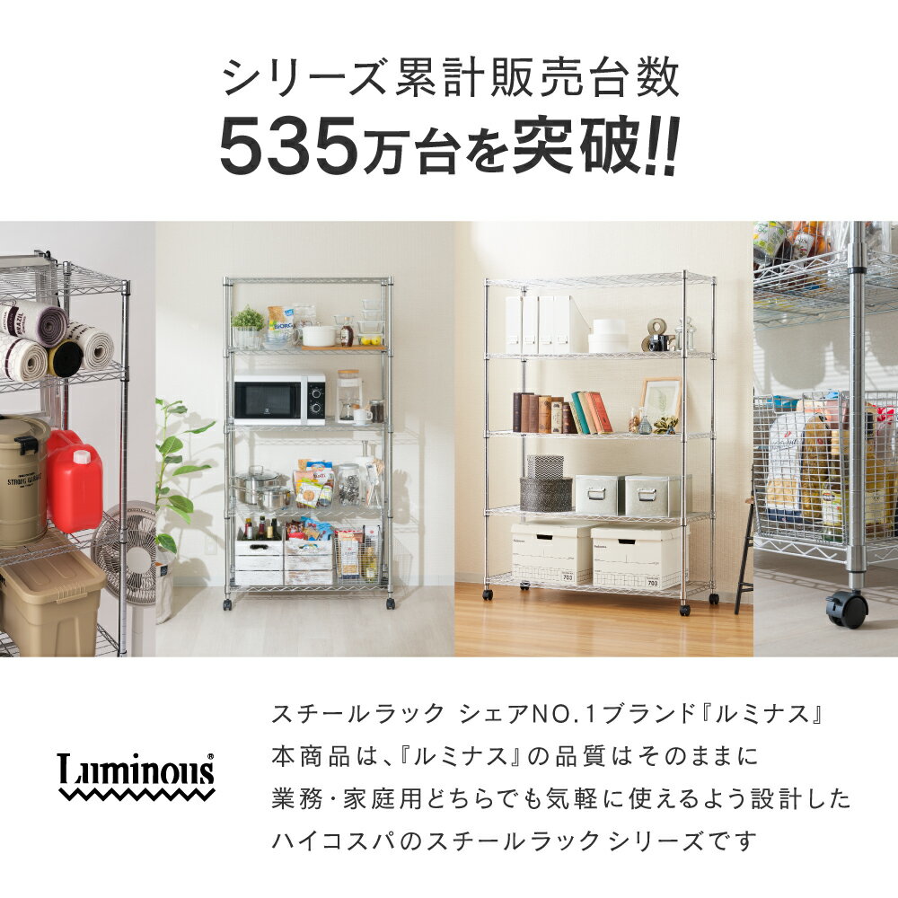 商品シリーズ [メタルルミナスシリーズ/メタル ラック] 型番 NE25-90185-12185 アイテムカテゴリ 組み立て式 スチールラック 外形寸法 121.5cm タイプ: 標準アジャスター装着時:(約)幅121.5×奥行46×高さ174cm ナイロンキャスター装着時:(約)幅121.5×奥行46×高さ178.5cm ウッドシート:(約)幅120×奥行44.5×厚み0.5cm コルクシート:(約)幅120×奥行44.5×厚み0.6cm 91.5cm タイプ: 標準アジャスター装着時:(約)幅91.5×奥行46×高さ174cm ナイロンキャスター装着時:(約)幅91.5×奥行46×高さ178.5cm ウッドシート:(約)幅89.5×奥行44.5×厚み0.5cm コルクシート:(約)幅89.5(44.75×2)×奥行44.5×厚み0.6cm ※コルクシートは2枚分割になります。 棚板 有効内寸 121.5cm タイプ: 幅114×奥行38.5cm 91.5cm タイプ: 幅84×奥行38.5cm 耐荷重(全体) アジャスター装着時:400kg キャスター静止時:300kg キャスター走行時:50kg 耐荷重(棚板1枚) 80kg 塗装・コーティング クロームメッキ 素材 シェルフ(棚)・ポール:スチール(クロームメッキ) スリーブ:ABS樹脂 ウッドシート:表面:塩化ビニル樹脂(PVC)、芯材:中質繊維板(MDF) コルクシート:コルク 本体重量(全体) 121.5cm タイプ: 18kg 91.5cm タイプ: 15.3kg ポール分割 2分割タイプ 上部ポール 85.1cm 下部ポール 86.8cm セット内容 棚板×5、ポール×4(分割式)、標準アジャスター×4、ナイロンキャスター(ストッパー付き)×2、ナイロンキャスター(ストッパーなし)×2、スリーブ(取付部品)20組、(選択した場合)ウッド/コルクシート×1※ウッド/コルクシートは別梱包となります。 備考 スチールラック業界TOPシェアの「ルミナス」シリーズで有名なドウシシャ製。 極限までコストをカットしたメタル製ラック。 こちらは「ルミナス」シリーズではございませんのでルミナスロゴプレート・刻印はございません。 ルミナスシリーズとの互換性はありますのでルミナス25mmポール用の各種パーツは問題なくご使用いただけます。 ネジ・釘いらずで女性でも簡単に組み立てることができます! 当店で取り扱っております 「ルミナススチールワイヤーラックシリーズ」「ドウシシャ製スチールラック」 につきましては 他メーカーのラック(メタル ラック・メタルシェルフ等)には互換性はございません。 特にお手持ちのラックからの追加購入やパーツ付け足しの際には各メーカーご確認の上ご購入下さい。 主な他メーカーのスチールラック 例) アイリスオーヤマ:メタル ラック/エレクター(株):ホームエレクター/YAMAZEN 山善・ヤマゼン:メタルシェルフ/ニトリ:スチールシェルフ などおすすめの拡張パーツ シェルフに乗せるだけで見た目のデザイン性がアップ。またワイヤーの隙間からの小物の落下を防ぎます。 コの字バーを足元に設置すればゴミ箱上ラックに早変わり。スチールラックをさらに安定させたいときは三角アジャスターや円形アジャスターに付け替えがおすすめです。 ▲スマホで体験型ショッピング!▲専用アプリ不要のARを使って、お部屋に試しおき!