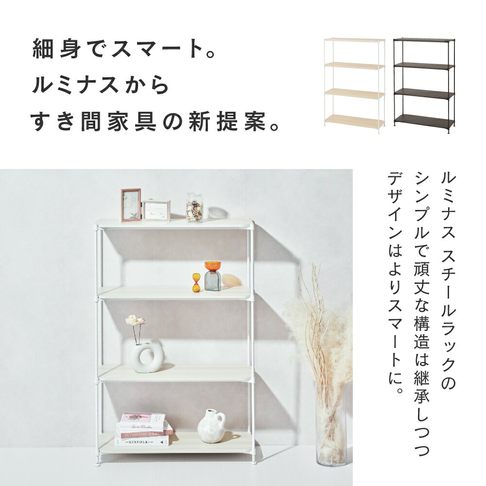 商品特徴 ■スマートな見た目でお部屋に圧迫感をあたえない ■木目調のシェルフ ■頑丈なスチールで補強 ■奥行きスリムな31cm設計 ■お部屋に合わせやすいカラー ■粉体塗装で防錆性が高く傷にも強い塗装 ■誰でも簡単組み立て ■拡張パーツもご用意 ポール径/シリーズ 12.7mm/ルミナス スマート Luminous SMART 型番/カラー C12-W804WH / ホワイトC12-W804BK/ ブラック 外形寸法 幅80.5×奥行31×高さ120cm 耐荷重(棚板1枚あたり) 30kg ※耐荷重の値は、スチールシェルフ(棚)全面に、均等に荷重をかけた場合の値になります。 全体耐荷重 120kg ポール分割サイズ 2分割タイプ: [上部ポール]59.5cm [下部ポール]59.0cm 材質 本体:スチール(エポキシポリエステル樹脂塗装)スリーブ:ABS樹脂木板:繊維化粧板+塩化ビニール アジャスター:スチール+PP セット内容 シェルフ×4枚、ポール×4本、スリーブ×16組(+予備1組)、説明書 外装サイズ 幅36×奥行84.5×高さ13.5cm 商品重量 12.0kg 外装込の重量 13.0kg カテゴリ スチールラック/リビング収納/おしゃれ JANコード C12-W804WH / 4550668474287 C12-W804BK/ 4550668474294 備考 スチールラック業界TOPシェアの「ルミナス」シリーズで有名なドウシシャ製。株式会社ドウシシャは大阪・東京に本社を置く日本の企業です。(東証プライム上場) 寸法・重量の数値について若干の誤差が生じる場合がございます。ルミナス スマートシリーズ 幅43.5cm 高さ72cmタイプ 幅43.5cm 高さ120cmタイプ(本ページ) 幅80.5cm 高さ72cmタイプ 幅80.5cm 高さ120cmタイプ スマートシリーズ 拡張パーツ 追加シェルフ 幅80.5cm 延長ポール 長さ31cm