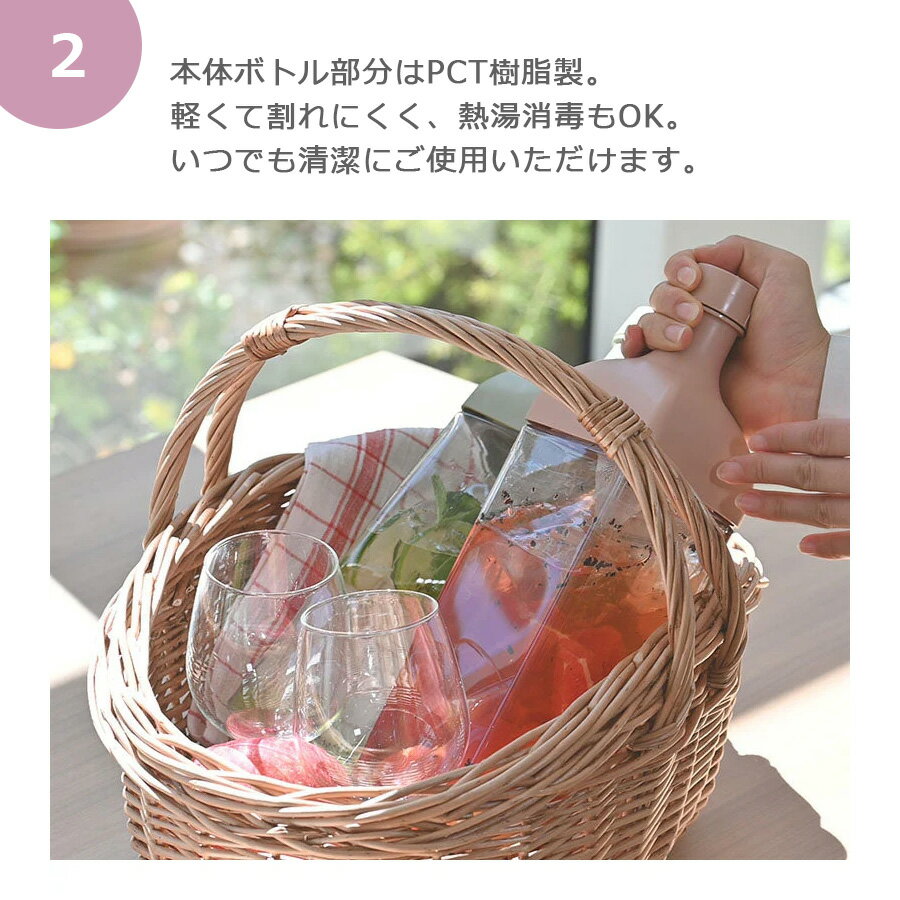 商品情報サイズ幅90・奥90・高320・口径85mm材質本体/PCT樹脂注口・キャップ・フィルター/ポリプロピレンパッキン/シリコーンゴム原産国日本製HARIO ハリオ カークボトル 冷茶 麦茶 ボトル 横置き 角型 1.2リットル 大容量 横置き保存ができる角型ボトル 横置き保存ができる角型ボトルが新登場。本体ボトル部分がPCT樹脂の角型ボトルです。注ぎ口内側にフィルターが付いているので水出し茶を作ることもできます。注口部分にフィルターがセットされているのでそのまま注げます。1,200mlの大容量なので、水出し茶はもちろんフレーバーウォーターをたっぷり作って保存して置けます。冷蔵庫の棚に横置き保存ができます。冷蔵庫のドアポケットにも収納OK。1.冷蔵庫の棚にも横置き保存ができる角型のボトル。2.本体ボトル部分はPCT樹脂製。軽くて割れにくく、熱湯消毒もOK。いつでも清潔にご使用いただけます。3.1.2リットルの大容量なので、水出し茶はもちろんフレーバーウォーターをたっぷり作って保存しておけます。4.注ぎ口の内側にフィルターが付いているので水出し茶を作って、そのまま注げます。5.冷蔵庫のドアポケットにも収納できます。6.口が広いからいろいろなフルーツが入れられます。■サイズ幅90・奥90・高320・口径85mm ■材質本体/PCT樹脂注口・キャップ・フィルター/ポリプロピレンパッキン/シリコーンゴム■原産国日本製 5
