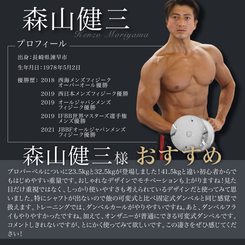 ◆ PROVERBELL ( プロバーベル ) 23.5kg 1.5kg刻み ◆ FLEXBELL 販売実績No.1受賞のライシンで、ついに23.5kgの重量で1.5kg刻みの可変式ダンベルを販売開始! 人気の高い フレックスベル に比肩する可変式ダンベルです。 メタル仕様の 可変式ダンベル 1.5kg刻み 23.5kg タイプです。 1.5kg単位で14段階もの重量を切り替えることが可能です。 片手で簡単に重量変更できるので、よりスムーズ・効率的なトレーニングが可能となります。 両端からシャフトが出ないので、よりコンパクトな動きも可能です。 また、機能性はもちろんのこと、デザイン性も高く高級感のあるアジャスタブルダンベルで、機能性とデザイン性を兼ね備えた進化を感じさせるダンベルです。 ご自身に合った重量でトレーニングができる上、1台で23.5kgの重量にもなるため、初心者から本格的なトレーニングをしている方まで幅広くご利用いただける逸品です。 なお、スタンドを使用することにより、ダンベルを持ち上げる際の腰への負担が軽減されますので、ダンベルとスタンドのセットがオススメです。 当店でお買い上げの場合は1年保証も付いております。 【ダンベル商品名】 PROVERBELL ( プロバーベル ) 23.5kg 【ダンベル変更可能重量】 4kg 5.5kg 7kg 8.5kg 10kg 11.5kg 13kg 14.5kg 16kg 17.5kg 19kg 20.5kg 22kg 23.5kg ※14段階重量切替可能 【ダンベルのカラー】※2色展開 シルバー ブラック 【スタンドのカラー】 ブラック 【サイズ】※1台あたり W36cm × D19.3cm × H19.3cm(ダンベル) W42cm × D23.5cm × H13cm(台座) スタンドにダンベルがのった状態:W84×D54.5×H77cm 【本体重量】※1台あたり(台座を含む) 25.5kg 【ダンベル仕様】 シャフトが出ない 金属 メタル 片手で重量変更可能 1.5kg重量切替 可変式 14段階 調節可能 アジャスタブル 握りやすいグリップ 滑りにくい 省スペース 組立不要 【デザイン】 高級感 上品 エレガント スタイリッシュ モダン おしゃれ コンパクト 次世代 新世代 都会 お洒落 【対象】 男性 女性 大人 学生 初心者 細マッチョ プロ マッチョ 【筋トレ方法により期待できる対象筋肉部位】 上腕二頭筋 上腕三頭筋 大胸筋 広背筋 胸筋 腹筋 背筋 三頭筋 大腿四頭筋 大腿二頭筋 内転筋 腕 肩 脚 足 太もも 上半身 下半身 【用途など】 筋トレ トレーニング ウェイトトレーニング エクササイズ スポーツ ダイエット 鉄アレイ 無酸素運動 有酸素運動 運動不足解消 二の腕運動 訓練 自宅 ジム 自宅ジム化 家トレ ホームジム プレゼント ギフト 贈答品クリックしますと再生されます。 ※動画内で使用されているダンベルは41.5kg、スタンドは旧型になります。 ■商品に共通する項目 原産国 中国 注意事項 ・ダンベル1個につき、最大で約1kgの誤差が生じます。ご理解の上ご注文ください。 ・使用後は汗を拭き取るなど行ってください。 ・バーベルシャフトの最大重量は120kgですが、バーベルシャフト本体の重量も含まれております。左右同重量(片方57.25kgまで)になるようにしてください。 ・ご自身に合った無理のないトレーニングを行ってください。 ・ご使用になる場合は、肌の露出を極力避け、トレーニングに適した服装で行ってください。 ■ダンベル 23.5kg 1個/2個 型番 1個:PROVER235 2個:PROVER235-2 本体重量 1個:25.5kg 2個:51kg 本体サイズ(1個あたり)※台座含む W42cm × D23.5cm × H23.5cm 切替重量 4kg-5.5kg-7kg-8.5kg-10kg-11.5kg-13kg-14.5kg-16kg-17.5kg-19kg-20.5kg-22kg-23.5kg(14段階) 個口数 1個:1個口 2個:2個口 ■専用スタンドセット 型番 PROVER235-2ST 総重量 65.5kg(ダンベル2個 + 専用スタンド) 本体サイズ W84 × D54.5 × H77cm(ダンベル2個 + 専用スタンド) セット内容 ダンベル2個 + 専用スタンド 個口数 3個口(ダンベル2個 + 専用スタンド) ■スタンドProセット 型番 PROVER235-2STPRO 総重量 64.9kg(ダンベル2個 + スタンドPro) 本体サイズ W:90cm × D:63.5cm × H:70.7cm(ダンベル2個 + スタンドPro) セット内容 ダンベル2個 + スタンドPro 個口数 3個口(ダンベル2個 + スタンドPro) ■専用スタンド・ベンチセット 型番 PROVER235-2ST-02 総重量 86kg(ダンベル2個 + 専用スタンド + ベンチ) セット内容 ダンベル2個 + 専用スタンド + ベンチ 個口数 4個口(ダンベル2個 + 専用スタンド + ベンチ) ■スタンドPro・ベンチセット 型番 PROVER235-2STPRO-02 総重量 85.4kg(ダンベル2個 + スタンドPro + ベンチ) セット内容 ダンベル2個 + スタンドPro + ベンチ 個口数 4個口(ダンベル2個 + スタンドPro + ベンチ) ■バーベルシャフトセット 型番 PROVER235-2-BAR セット内容 ダンベル2個 + バーベルシャフト 個口数 3個口(ダンベル2個 + バーベルシャフト) ※サイズ・重量には多少の誤差が生じる場合がございます。 ※お使いのモニター環境などにより、掲載画像と実際の商品の色味が若干異なる場合がございます。 ※多少のキズ・ヨゴレ等がある場合がございます。 ※仕様は予告なく変更される場合がございます。