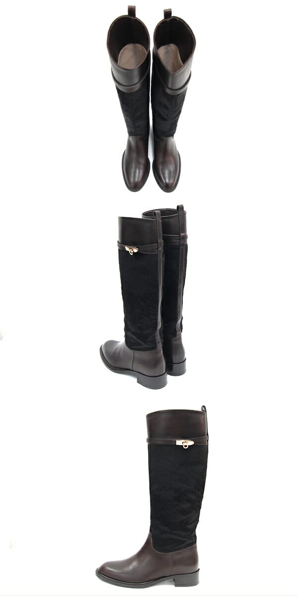 フェラガモ レディースシューズ ガンチーニ ロングブーツ ダークブラウン レザー ハラコ サイズ5.5 中古 ロングブーツ ゴールド金具 レディース Salvatore Ferragamo