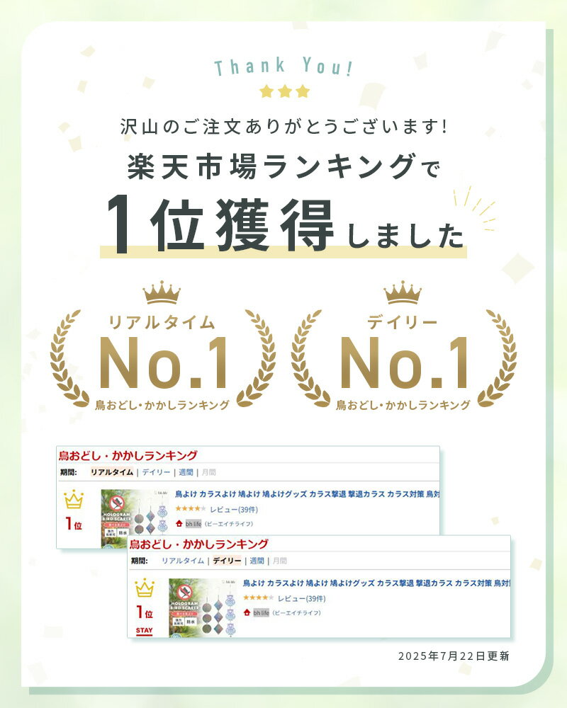 商品情報ブランド名bh life鳥よけ カラスよけ 鳩よけ 鳩よけグッズ カラス撃退 撃退カラス カラス対策 鳥対策 鳥よけグッズ 鳩 対策 グッズ こうもりよけ カラスよけグッズ ベランダ カラス避け 撃退 対策 屋上 窓枠用 軽い 景観を損なわない フクロウ オシャレ 送料無料 防鳥 鳥 避け 鳥よけ 鳩よけ反射板 乱反射 ベランダ フン害防止 ホログラム板 鈴付き 吊り下げ式 長さ調整可能 防水 鳥が逃げる 鳥害 家庭菜園 撃退 鳩除け 鳥のフン ムクドリ 【商品説明】■ホログラム素材が、太陽光を強烈に反射鳥が苦手な太陽光を反射させる、ホログラム素材を採用。ゆらゆらと揺れながら、強烈に太陽光を反射させ、鳥を寄せ付けません!■不規則な動きで警戒させるそれぞれの反射板が独立したデザインなので、風に揺れるたびに不規則に動きます。その動きが野鳥を警戒させ、ベランダ等に近寄らせません。■飾りたくなるデザインよくあるリアルな鳥の置物は怖いし、スパイクは危険だし、鳥を傷つけることはしたくない・・・そんな方でも、インテリア感覚で飾っていただけるような、おしゃれなデザインです。フックで引っ掛けるだけなので、設置も簡単♪■スペースに合わせて、アレンジ可能反射板の枚数を変えることで、長さの調整が可能。設置場所のスペースに合わせたサイズで、使っていただけます。■屋外でも安心の防水素材防水効果のあるPET素材なので、突然の雨でも安心◎慌てて室内に避難させる必要がありません。【商品詳細】●サイズ(約)フクロウタイプ:61×12cmダイヤタイプ:40×7.5cm丸型タイプ :38×7.5cm※寸法は多少の誤差が生じる場合がございます。※詳細は説明画像をご参照下さい。●バリエーション・フクロウ(3連タイプ/5個セット)・ダイヤ(3連タイプ/8個セット)・丸形(3連タイプ/8個セット)【注意事項】・パソコン・モニター等により実際の商品と多少色味が異なる場合がございます。その他関連ワード: 鳩よけ対策グッズ 鷹 フェンス 取付簡単 最強 2