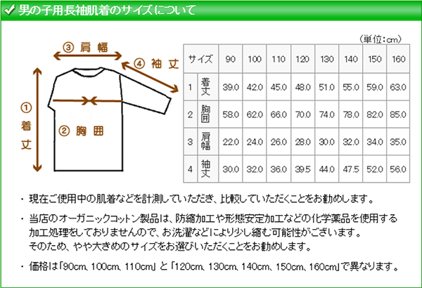 肌着サイズ・身長120cm・身長130cm・身長140cm・身長150cm・身長160cm (身長90cm-110cmの商品はこちら) 生地・カラー A.ボタニカル接結ドット(ストロベリー) B.ボタニカル接結ドット(ブルーベリー) C.草木染め接結ドット(ブラック) D.接結ドット(ブラウン) E.エリゼフライス(きなり) F.エリゼフライス(ブラウン) G.天竺ピンボーダー(ブラウン) H.天竺ピンボーダー(グリーン) I .天竺3色ボーダー J.フライス起毛(きなり) K.フライス起毛(ブラウン) L.フライス起毛(ボーダー) 染色加工 A・B:ボタニカル・ダイ(※) その他:無漂白、無染色 生地の素材 綿100%【オーガニックコットン100%】 縫製糸 「ポリエステル糸」と 「オーガニックコットン糸」から選択可 縫い目 「内側」と「外側」から選択可 製造国 日本製 配送方法真空パック包装にて配送 ※ボタニカル・ダイとは 植物の花びら・葉茎・種・実・果皮などから抽出した色素と少量の化学染料を併用することで堅牢な色を実現した新しい染色技術です。 この商品はゆうパケット配送が可能な商品です。他の商品も含めてゆうパケット配送可能な商品に枚数制限はなく、何枚ご購入されても送料は250円です。また税込3,980円以上のご注文でゆうパケット配送が無料となります。 ゆうパケット配送に関する詳しい情報につきましては、こちらをご確認下さい。 下着・インナー・アンダーウエア・Kids・T-shirt・長袖Tシャツジュニア男の子用・選べる12種類 長袖肌着 (120、130、140、150、160cm) ※2024年7月から一部の生地を変更しました 長袖肌着(Tシャツ)生地の特徴 【ボタニカル接結ドット生地】 生地の厚さ:★★★★☆ 薄手の生地を2枚重ねてドットで結んだ2重構造の生地。2枚重ねの厚みがありながら、薄手生地の柔らかさも兼ね備えた肌触りの気持ち良い生地で、伸縮性もあって下着・肌着に向いています。染色はストロベリー・ブルーベリーの果実から抽出した色素に安全な化学染料を組み込んで染めたボタニカル・ダイです。綿染めのナチュラルな色調は肌にも目にも優しく、また綿から染める事で染色工程の水が少なく済むなど環境にも優しい染色になっています。 ※染色に使われる化学染料は、繊維の安全基準であるエコテックス®の基準に合致したものです。 【接結ドット生地】 生地の厚さ:★★★★☆ ABと同じく、薄手の生地を2枚重ねてドットで結んだ2重構造の生地です。2枚重ねの厚みがありながら、薄手生地の柔らかさも兼ね添えた肌触りの気持ち良い生地で、伸縮性もあって下着・肌着に向いています。生地のブラウンは染色ではなく、茶色の綿から作られた天然カラーです。 この製品はNOCコットン認定の製品です。 【エリゼフライス生地】 生地の厚さ:★☆☆☆☆ パターンメッシュ素材のエリゼ生地は、通気性に優れた生地。やや薄手の涼しい商品なので、春から秋向けの商品です。特に夏場に、汗をかきやすい体質の人にはオススメで、ポエステルやナイロンなどの化学繊維と違って、汗も吸収するのでお肌にも良いです。 この製品はNOCコットン認定の製品です。 【天竺生地】 生地の厚さ:★★★☆☆ 天竺生地はTシャツや肌着などによく使用されるポピュラーな生地で、水分を吸収しやすく柔らかいのが特徴。3種類ともボーダー生地で、厚さと肌触りは全く同じです。 なお、グリーンやブラウンは綿の天然色ですので、染色はしておりません。 この製品はNOCコットン認定の製品です。 【フライス起毛生地】 生地の厚さ:★★★☆☆ 生地は厚手ではありませんが、肌側に小さな起毛があり、ふわふわの肌触りで温かいのが特徴です。最近は化学繊維の温かな素材の商品が人気ですが、この生地はさらに肌触りがとっても心地よく、汗も吸収するので、化学繊維が苦手な人にもご愛用いただける素材です。 この製品はNOCコットン認定の製品です。 色々な生地をお試しいただき、お気に入りを見つけてください♪ 業界初!「縫い目」を【内側】と【外側】から選べる♪ 当店ではお肌の敏感なお子様には、縫い目を「外側」にして縫製も可能です。 縫い目を「外側」にすると見栄えは悪くなりますが、お肌への刺激は少なくります。 「縫い糸」も【オーガニック糸】と【ポリエステル糸】からお選びいただけます これまで当店では販売する殆どの商品の縫い糸に「オーガニックコットン糸」を使用しておりましたが、強度が少し弱く、洗濯などで糸がほつれるなど、耐久性に若干の問題がありました。 そこで当店では「縫い糸」をお選びいただけるようにしました。標準仕様は「ポリエステル糸」、化学物質過敏症やアトピー性皮膚炎など、肌が敏感なお子様には「オーガニックコットン糸」がオススメです。 通常タグは襟元に付いていますが、この肌着は刺激にならないよう肌着の外側(表側)に付いています。 さらにこれまではタグは必要ないというお客様が多いので、取り外しやすいように縫製されおりました。 しかし「タグがないと子供が表と裏の区別できない」、「保育園用に名前を書
