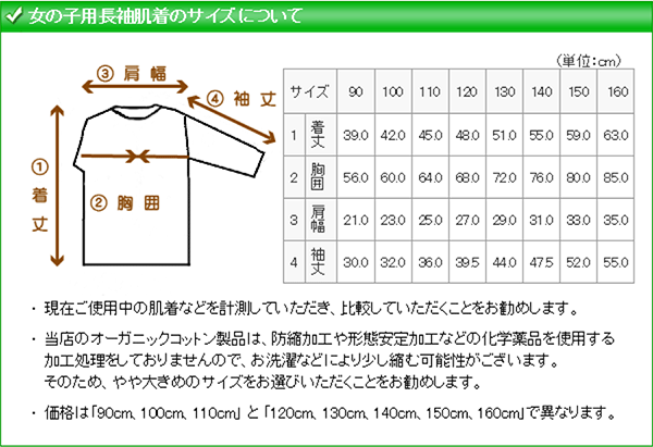肌着サイズ ・身長120cm・身長130cm・身長140cm・身長150cm・身長160cm (身長90cm-110cmの商品はこちら) 生地・カラー A.ボタニカル接結ドット(ストロベリー) B.ボタニカル接結ドット(ブルーベリー) C.草木染め接結ドット(ブラック) D.接結ドット(ブラウン) E.エリゼフライス(きなり) F.エリゼフライス(ブラウン) G.天竺ピンボーダー(ブラウン) H.天竺ピンボーダー(グリーン) I .天竺3色ボーダー J.フライス起毛(きなり) K.フライス起毛(ブラウン) L.フライス起毛(ボーダー) 染色加工 A・B:ボタニカル・ダイ(※) その他:無漂白、無染色 生地の素材 綿100%【オーガニックコットン100%】 縫製糸 「ポリエステル糸」と 「オーガニックコットン糸」から選択可 縫い目 「内側」と「外側」から選択可 製造国 日本製 配送方法 真空パック包装にて配送 ※ボタニカル・ダイとは 植物の花びら・葉茎・種・実・果皮などから抽出した色素と少量の化学染料を併用することで堅牢な色を実現した新しい染色技術です。 この商品はゆうパケット配送が可能な商品です。他の商品も含めてゆうパケット配送可能な商品に枚数制限はなく、何枚ご購入されても送料は250円です。また税込3,980円以上のご注文でゆうパケット配送が無料となります。 ゆうパケット配送に関する詳しい情報につきましては、こちらをご確認下さい。 下着・インナー・アンダーウエア・Kids・T-shirt・長袖Tシャツジュニア女の子用・選べる12種類 長袖肌着 (120、130、140、150、160cm) ※2024年7月から一部の生地を変更しました 長袖肌着(Tシャツ)生地の特徴 【ボタニカル接結ドット生地】 生地の厚さ:★★★★☆ 薄手の生地を2枚重ねてドットで結んだ2重構造の生地。2枚重ねの厚みがありながら、薄手生地の柔らかさも兼ね備えた肌触りの気持ち良い生地で、伸縮性もあって下着・肌着に向いています。染色はストロベリー・ブルーベリーの果実から抽出した色素に安全な化学染料を組み込んで染めたボタニカル・ダイです。綿染めのナチュラルな色調は肌にも目にも優しく、また綿から染める事で染色工程の水が少なく済むなど環境にも優しい染色になっています。 ※染色に使われる化学染料は、繊維の安全基準であるエコテックス®の基準に合致したものです。 【接結ドット生地】 生地の厚さ:★★★★☆ ABと同じく、薄手の生地を2枚重ねてドットで結んだ2重構造の生地です。2枚重ねの厚みがありながら、薄手生地の柔らかさも兼ね添えた肌触りの気持ち良い生地で、伸縮性もあって下着・肌着に向いています。生地のブラウンは染色ではなく、茶色の綿から作られた天然カラーです。 この製品はNOCコットン認定の製品です。 【エリゼフライス生地】 生地の厚さ:★☆☆☆☆ パターンメッシュ素材のエリゼ生地は、通気性に優れた生地。やや薄手の涼しい商品なので、春から秋向けの商品です。特に夏場に、汗をかきやすい体質の人にはオススメで、ポエステルやナイロンなどの化学繊維と違って、汗も吸収するのでお肌にも良いです。 この製品はNOCコットン認定の製品です。 【天竺生地】 生地の厚さ:★★★☆☆ 天竺生地はTシャツや肌着などによく使用されるポピュラーな生地で、水分を吸収しやすく柔らかいのが特徴。3種類ともボーダー生地で、厚さと肌触りは全く同じです。 なお、グリーンやブラウンは綿の天然色ですので、染色はしておりません。 この製品はNOCコットン認定の製品です。 【フライス起毛生地】 生地の厚さ:★★★☆☆ 生地は厚手ではありませんが、肌側に小さな起毛があり、ふわふわの肌触りで温かいのが特徴です。最近は化学繊維の温かな素材の商品が人気ですが、この生地はさらに肌触りがとっても心地よく、汗も吸収するので、化学繊維が苦手な人にもご愛用いただける素材です。 この製品はNOCコットン認定の製品です。 色々な生地をお試しいただき、お気に入りを見つけてください♪ 業界初!「縫い目」を【内側】と【外側】から選べる♪ 当店ではお肌の敏感なお子様には、縫い目を「外側」にして縫製も可能です。 縫い目を「外側」にすると見栄えは悪くなりますが、お肌への刺激は少なくります。 「縫い糸」も【オーガニック糸】と【ポリエステル糸】からお選びいただけます これまで当店では販売する殆どの商品の縫い糸に「オーガニックコットン糸」を使用しておりましたが、強度が少し弱く、洗濯などで糸がほつれるなど、耐久性に若干の問題がありました。 そこで当店では「縫い糸」をお選びいただけるようにしました。標準仕様は「ポリエステル糸」、化学物質過敏症やアトピー性皮膚炎など、肌が敏感なお子様には「オーガニックコットン糸」がオススメです。 通常タグは襟元に付いていますが、この肌着は刺激にならないよう肌着の外側(表側)に付いています。 さらにこれまではタグは必要ないというお客様が多いので、取り外しやすいように縫製されおりました。 しかし「タグがないと子供が表と裏の区別できない」、「保育園用に名前を書