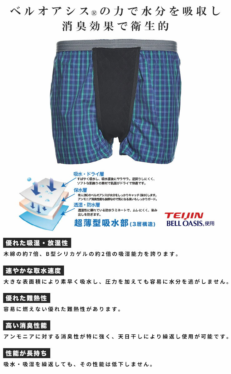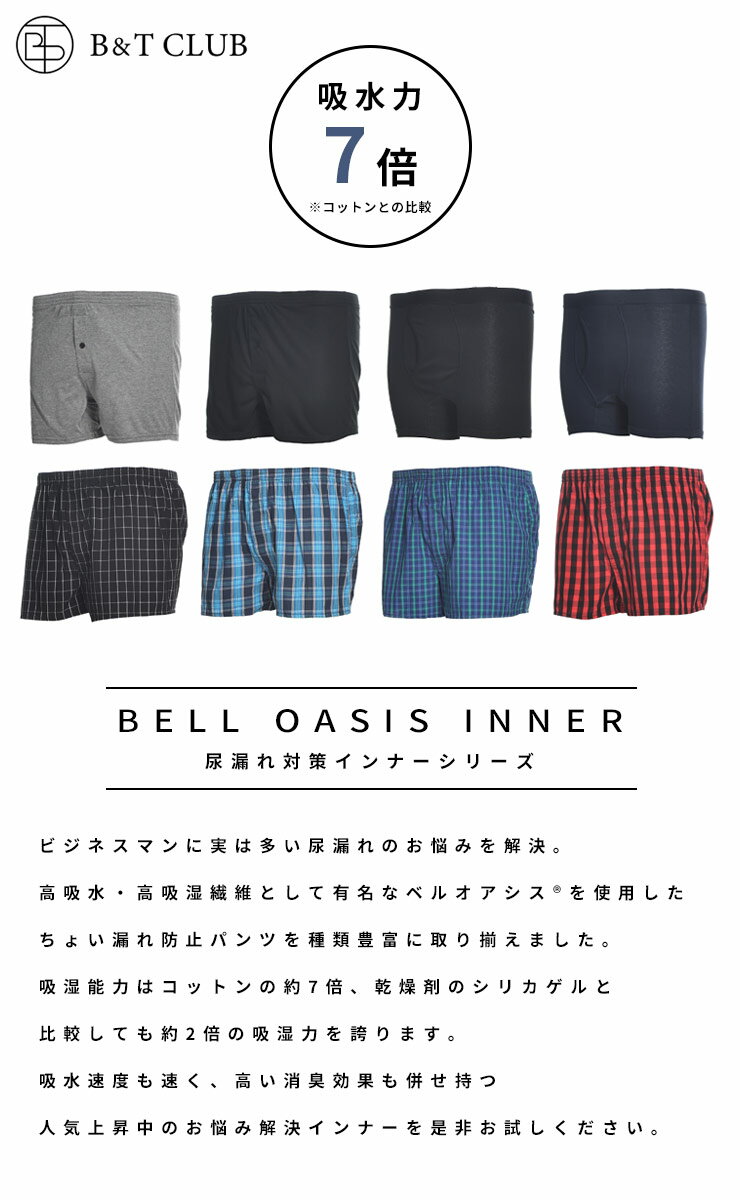 サカゼンオリジナルブランドB&T CLUBからちょいモレ対応安心肌着登場。驚異の吸水・吸湿パワーを秘めた繊維、BELL OASISベルオアシスを採用。吸水性能は自重の80倍、吸湿性能としては150%を有し、その他にも難燃性能、消臭性能を持つ画期的な高吸水・高吸湿繊維です。シンプルで使いやすく、普段使いでも、介護肌着としてもぴったりなアイテムです。※衛生面の都合上、返品不可となりますのでご了承下さい。COLORSWhich color are you going to choose?DETAILcollar pocket sleeve button hem printed tag and more...ANGLEfront and side and back" s angle are introducedVARIATIONPlain color, barred patterns and and all that with check patterns■ 商 品 説 明 ■商品名大きいサイズ メンズ B&T CLUB (ビーアンドティークラブ) 安心 ちょいモレ チェック柄 前開き トランクス 失禁パンツ 介護 尿漏れブランドB&T CLUB素材[本体]綿100% [防水布表地]ポリエステル100% [中綿]アクリル40% レーヨン20% ポリエステル20% ベルオアシス20% [裏地]ポリウレタン100%サイズ展開【3L】【4L】【5L】【6L】【7L】【8L】生産国中国コメントサカゼンオリジナルブランドB&T CLUBからちょいモレ対応安心肌着登場。驚異の吸水・吸湿パワーを秘めた繊維、BELL OASISベルオアシスを採用。吸水性能は自重の80倍、吸湿性能としては150%を有し、その他にも難燃性能、消臭性能を持つ画期的な高吸水・高吸湿繊維です。シンプルで使いやすく、普段使いでも、介護肌着としてもぴったりなアイテムです。※衛生面の都合上、返品不可となりますのでご了承下さい。仕様防水布(ベルオアシス)使用 / 前開き / 吸湿性 / 放湿性サイズ(cm)ウエスト脇丈メーカー対応ウエスト3L763798-1084L8039104-1145L8441110-1206L8843118-1287L9245124-1348L9647130-140