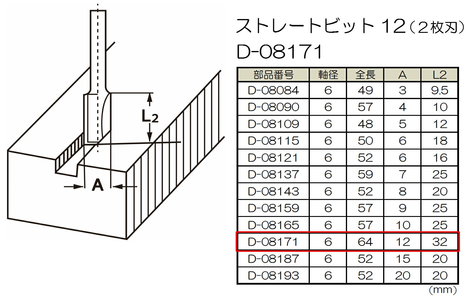 マキタ トリマ用ストレートビット 12mm (6mm軸) D-08171