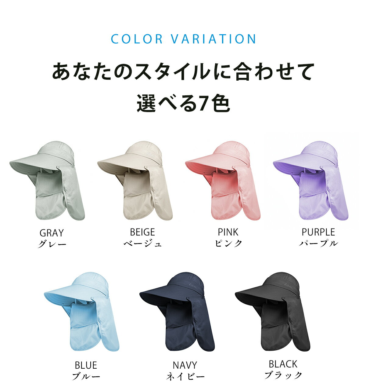 商品名4WAY UVカット帽子 サイズ 頭周り:約48〜61cm つば:約14cm 素材ポリエステル カラーグレー、ベージュ、ピンク、パープル、ブルー、ネイビー、ブラック ※あご紐は、全て「ライトグレー」色に統一されました。 産地中国 商品紹介 今年こそ、絶対日焼けしないための4WAY UVカット帽子が登場します!頭だけでなく、顔、首元までしっかり紫外線対策ができます。 <4way> ・サンバイザー ・つば広ハット ・ネックカバー ・フェイスカバー ジッパーやスナップボタンで簡単に取外しができてストレスフリー!用途に応じて被り方を変えるのが魅力的なポイント♪ UPF50+&紫外線遮断95%以上。紫外線と暑さからお肌を守りますね〜 吸湿性と速乾性にも優れている生地を採用、汗をかいても蒸れにくいです。 フェイスカバーパーツはメッシュ仕様で通気性が抜群し、呼吸や会話も楽になるのが特徴。 さらに、着けたまま飲み物OK!とても便利〜 全部で7色展開!毎日のお出かけに大活躍◎ 夏の旅行、ゴルフ、スポーツ観戦、アウトドアなどにおススメ逸品です。 おすすめポイント 【4way使える〜シーンに合わせて万全な紫外線対策を!】 取り外し可能なパーツを組み合わせて、フェイスカバー・ネックカバー・つば広ハット・サンバイザーに形が変化させることが可能。 普段着からアウトドアまでいろんなコーデのUV対策に!お顔と首周りを徹底カバー、気温が高い日でも快適に過ごせます。 【UPF50+、日焼け止め効果の高い帽子!】 紫外線保護係数UPF50+、遮断95%以上を達成!日常の紫外線や強い日差しからお肌を守るUVカット帽子。 紫外線をしっかりガードできる優れもので、日傘が使えない時でも抜群の安心感を与えるし、荷物がスリム化されます。 【持ち運びやすい&7色展開“才色兼備”な帽子】 キャップとフェイス・ネックカバーをクルッとコンパクトにまとめる仕様で、バッグなどにスッキリと収納して持ち歩けます。型崩れの心配が少なく、必要なときにサッと取り出せて非常に便利です。 グレー・ベージュ・ピンク・パープル・ブルー・ネイビー・ブラックのカラフルな7色展開、気分で選んでもあなたのスタイルを完成させます。 【広めのつばでしっかり顔をカバー】 幅がしっかり14.0センチあるツバ広デザインになっている帽子は、お顔周りにしっかりと日陰を作ります。シミやたるみの原因となる紫外線を徹底カード、ばっちり日焼けを防げます。 【通気性が良いフェイスカバー】 フェイスカバーは蒸れにくくメッシュ素材を採用。顔を守りながら、通気性もあるので長時間身につけていても息苦しさを感じにくいです。口元部分が開くタイプで、呼吸や会話がラクにできます。 【ヘアスタイルも崩れず快適にかぶれる】 髪の毛を結んだまま帽子を被るデザイン。マジックテープ式にバックベルトで、頭周りのサイズ調整可能です。ネックカバーもボタンで着脱できるロングタイプなので、紫外線から気になる首元をガードする上に、髪型が崩れにくいです。 【取り外し可能なあご紐付き】 あご紐付きなので風に飛ばされることがありません。自転車走行時や、風の強い日でも安心! 利用シーン ウォーキング ペットのお散歩 ガーデニング 釣り アウトドア スポーツ観戦 旅行 出張 通勤 通学 自転車走行 ゴルフ 運動会 スポーツ 作業 農作業 山登り アクティビティ ちょっとしたお出かけ 外遊び 観光 プール 買い物 車の運転 肌のお手入れ中の方 小さいお子さまのいる方 各パーツ取り付け方法 サンバイザーの状態から、つば広ハット→ネックカバー→フェイスカバー それぞれの組立方法をご紹介します。 ⚫つば広ハットの組立方法 サンバイザーとのキャップ部分をファスナーで合体して完成。 ⚫ネックカバーの組立方法 キャップにしてから、ネックカバーを4か所のスナップボタンで留めて完成。 ⚫フェイスカバーの組立方法 ネックカバーにしてから、さらにフェイスカバーを4か所の内側ボタンで留めて完成。 ご注意点 ※製品仕様やパッケージは改良のため予告なく変更される場合があります。 ※手作業での採寸の為1〜3cmの誤差が生じる場合がございます。ご了承頂きますようお願い致します。 ※掲載されている商品画像は、お客様のモニター環境や撮影時のライティングにより実際のものと素材感・色が若干異なって見える場合がございます。 ※新品生地の独自の匂いがする場合がございます。袋に入れた状態で保管しているため、個人差はございますが開封時強く感じる場合があります。ご使用いただくと徐々に緩和されていきます。 日常の贈り物 小学生 中学生 高校生 大学生 母の日 父の日 夏休み 初盆 お盆御 中元 お中元 お彼岸 敬老の日 春夏秋冬 ゴールデンウィーク GW 新生活 ギフト プレゼント お誕生日 誕生日 お父さん お母さん 子供 おばあちゃん おじいちゃん 奥さん 彼女 旦那さん 彼氏 先生身近な方 家族 大切な方 お世話になった方 目上の方ちょっとした贈り物 景品 サンクス ありがとう 20代 30代 40代 50代 60代 