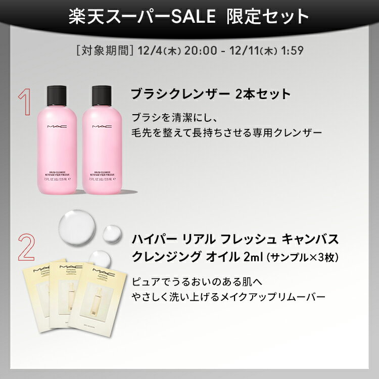 ブラシ クレンザー ■セット内容■ ・ブラシ クレンザー 235ml ×2 ・ハイパー リアル フレッシュ キャンバス クレンジング オイル 2ml×3 ■製品の詳細■ ブラシを清潔にし、毛先を整えて長持ちさせる専用クレンザー。雑菌やニオイを防ぎ、クリーンな状態をキープ。乾きやすいのも特徴。 ■製品の特徴・特性■ ブラシを清潔にし、毛先を整えて長持ちさせる専用クレンザー。 ■使用方法■ 布かタオルをしめらせ、毛を傷めないように注意しながら化粧品が落ちるまでやさしくふき取ります。 製品名 ブラシ クレンザー メーカー名 M・A・C 内容量 235 ml 区分 化粧品 原産国 アメリカ 広告文責 ELCジャパン合同会社 0120-815-750 注意事項 商品の改良等により成分や原産国等の表示内容が変更になる場合があります。実際の成分や原産国は商品の表示をご確認ください。 販売履歴 【詳しくはこちら】楽天スーパーSALE限定セット [対象期間] 12月4日(木) 20:00 - 11日(木) 01:59 ※レビューは単品販売ページより引用しています。