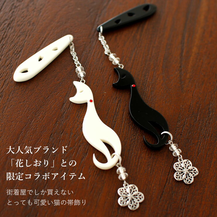 \18日はご愛顧感謝DAY/[ 日本製 ] 花しおり × 街着屋 帯飾り ネコシャララ 黒 白 根付 ねつけ ルビーレッド ストーン 黒猫 白猫 赤 ストーン 浴衣 着物 小紋 紬 デニム着物 浴衣飾り ねこ cat 動物 限定 お洒落 モダン 可愛い シンプル 根付け (fu304)