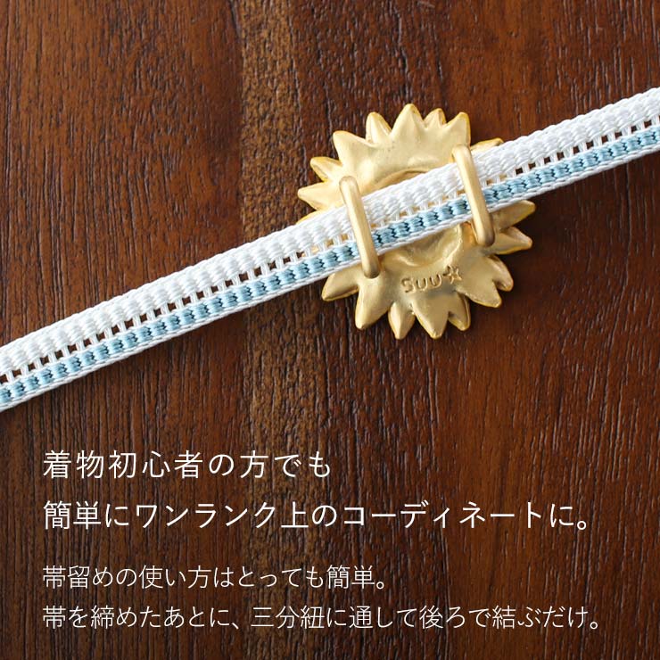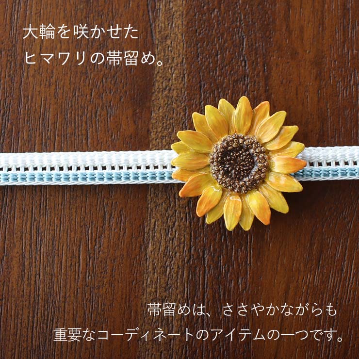 その他の「帯締め/三分紐」はこちらから♪ その他の「帯留め」はこちらから♪ [関連カテゴリー] ヒマワリ (OD088) 向日葵 サンフラワー 太陽 黄 金 ゴールド 可愛い 大輪 かわいい おしゃれ 個性的 帯どめ 日本製 SUU 数 帯留め 帯留 おびどめ 帯飾り ストラップ チャーム 帯 半巾帯 名古屋帯 袋帯 お太鼓 文庫 変わり結び アンティーク ブローチ 金具 アクセサリー アレンジ おしゃれ かわいい かっこいい レトロ モダン ハイセンス 大正 普段使い 普段着 洒落着 お出かけ着 カジュアル レディース 女性用 贈り物 ギフト プレゼント クリスマス バレンタイン 誕生日 バースデー 記念日 [街着屋は「気ままに着物な和の生活」を応援します。] 和服 和小物 セレクトショップ 街着屋〜きもの遊び〜 は「普段着気分でキモノを楽しむ、気ままに着物な和の生活」を応援します。 撫松庵 召しませ花 岡重 嵐山よしむら 創世舎 などの 人気 呉服 和装ブランド をはじめ 着物 浴衣 訪問着 色無地 江戸小紋 のロングセラー着物や 袋帯 名古屋帯 半巾帯 立体裁断縫製 の 紙人形 長襦袢 草履 下駄 はもちろん 和装をより華やかに彩る 半衿 帯締め 帯揚げ など厳選し 髪飾り かんざし 和装バッグ や 便利アイテムの 着付け小物 などのオシャレな 和雑貨 まで 10代 20代 30代 40代 50代 60代 70代 80代 と幅広い年齢層の方にお楽しみいただけるような商品を販売からレンタルまで何でも取り揃えています。 [着物を着るイベントいろいろ] お宮参り 初宮参り 百日参り 百日祝い お食い初め 初正月 初節句 初誕生 紐落とし 七五三 753 入学式 卒業式 入園式 卒園式 成人式 結婚式 結納 還暦 古希 喜寿 傘寿 米寿 卒寿 白寿 紀寿 百寿 お葬式 葬儀 追悼式 など 子供 や 孫 から 娘 息子 母親 父親 祖父 祖母 まで 家族 親族 友人 大切な人の 祝い事 慶事 や 弔事 など 人生の ライフイベント に。礼装 正礼服 フォーマル 準礼装 準礼服 セミフォーマル や 略礼装 平服 インフォーマル まで様々な シーン に対応した商品を取り揃えております。 茶道 お茶 華道 お花 弓道 お琴 三味線 蛇味線 尺八 和楽器 雅楽 踊り 日本舞踊 舞 舞台 神楽 能 カラオケ 歌謡 など 様々な 習い事 や お稽古 の 衣裳 として。旅行 や 歌舞伎 宝塚 ミュージカル コンサート などの 観劇 、 散策 街歩き カフェめぐり 、デパート で ショッピング 買い物 などの お出かけ や 普段 日常 日頃 の ちょっとした おしゃれ を楽しむ 洒落着 としてもお楽しみいただけるような レトロ モダン で 粋 なアイテムも充実しております。 また 誕生日 の バースデープレゼント クリスマス バレンタイン ホワイトデー 桃の節句 お雛様 雛祭り 端午の節句 こどもの日 敬老の日 など イベント事 や 節目 、 祝祭 祝賀 祝宴 慶賀 吉事 などの お祝い の席や 内祝い などの 贈り物 として プレゼント や ギフト にもおすすめです。 [取り扱いブランド] 創世舎 tsuki to kame 紙人形 仕立て 撫松庵 召しませ花 召しませ華 嵐山よしむら 本場筑前 博多織 ViVi tsumori chisato ツモリチサト 花しおり 和風館 乙葉 九重×中村里砂 JAPAN STYLE×中村里砂 玉城ティナ×紅一点 つやび×雅姫 吉田沙保里×JAPAN STYLE 芸艸堂 岡重 JILLSTUART 龍村美術 NATURAL BEAUTY 榛原 Modern Antenna キスミス きもの道楽 渡敬 衿秀 き楽っく きらっく 高島ちぢみ 近江ちぢみ [取り扱いアイテム] 洗える 訪問着 付け下げ 留袖 黒留袖 色留袖 色無地 江戸小紋 浴衣 ゆかた 小紋 ブランド着物 ふりそで 振袖セット 袴セット はかま 長襦袢 肌襦袢 半襦袢 ローズカラー うそつき襦袢 和装肌着 ステテコ 裾よけ ズロース 補整下着 袋帯 名古屋帯 半巾帯 細帯 小袋帯 兵児帯 帯リボン 角帯 作り帯 大島紬 結城紬 絣 草履 ぞうり 下駄 時雨履き 雪駄 雪踏 足袋 手袋 たとう紙 腰紐 伊達締め 帯締め 帯〆 帯揚げ 半衿 伊達衿 重ね衿 三分紐 四分紐 帯留め 帯飾り 前板 帯板 帯枕 きものクリップ コーリンベルト 風呂敷 マスク 和装バッグ 巾着 信玄袋 財布 和雑貨 扇子 末広 扇 髪飾り ヘアー小物 日傘 名刺入れ 晒 ハンカチ 手拭い 正座椅子 暖簾 お初着 一つ身 三つ身 四つ身 被布 着物 kimono きもの 和服 わふく 呉服 五福 ごふく 着るもの 衣服 衣類 袷 単衣 夏着物 絽きもの 羽織 はおり 道中着 道行 長羽織 コート ケープ ショール ポンチョ カッパ 合羽 雨コート ちりめん 東レ シルック 絹 シルク 綿 コットン 羊毛 ウール ポリエステル アンゴラ ベルベット「絵本のような帯留めシリーズ」大輪を咲かせたヒマワリの帯留め。 花びらには複数の黄色を重ねて着色し、焦がれる夏の日差しを表現しています。 大柄のデザインが多い浴衣に合わせても負けない、コーディネートの主役になる帯留めです。 丁寧な細工が可愛らしい帯留めシリーズ。 小さな帯留めにぎゅっと詰まった独特な世界観が魅力。帯留めはささやかながらも重要なコーディネートのアイテムの一つ。あなたの着物ライフをより一層素敵なものにしてくれます。 帯を締めたあとに、三分紐に通して後ろで結ぶだけ。 帯留めの使い方はとっ