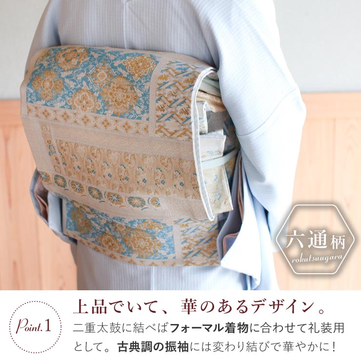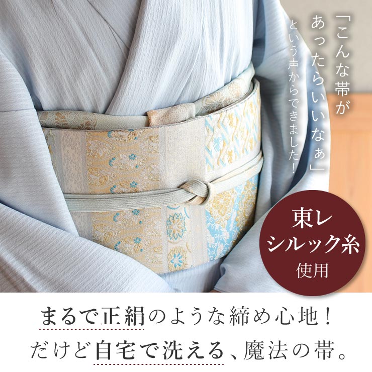 ▼ 街着屋の “洗える” 袋帯 [関連カテゴリー] 二重太鼓 お太鼓 袋帯 有職文 有職文様 更紗 現代風 縁起物 吉祥 菊 花 華紋 青 ブルー 水色 グレー 灰色 灰青 セルリアンブルー 金 ゴールド 華やか 艶やか 豪華 洗える帯 東レシルック シルック シルック糸 東レ 洗濯できる ウォッシャブル 振袖 訪問着 付け下げ 江戸小紋 色無地 フォーマル 礼装用 前結び 変わり結び 簡単 アレンジ 上品 華やか 大人 入学式 卒業式 入園式 卒園式 お正月 結婚式 七五三 お茶会 イベント 仕立て上がり 洗える 魔法 経済的 衛生的 お稽古 たとう紙 日本製 [街着屋は「気ままに着物な和の生活」を応援します。] 和服 和小物 セレクトショップ 街着屋〜きもの遊び〜 は「普段着気分でキモノを楽しむ、気ままに着物な和の生活」を応援します。 撫松庵 召しませ花 岡重 嵐山よしむら 創世舎 などの 人気 呉服 和装ブランド をはじめ 着物 浴衣 訪問着 色無地 江戸小紋 のロングセラー着物や 袋帯 名古屋帯 半巾帯 立体裁断縫製 の 紙人形 長襦袢 草履 下駄 はもちろん 和装をより華やかに彩る 半衿 帯締め 帯揚げ など厳選し 髪飾り かんざし 和装バッグ や 便利アイテムの 着付け小物 などのオシャレな 和雑貨 まで 10代 20代 30代 40代 50代 60代 70代 80代 と幅広い年齢層の方にお楽しみいただけるような商品を販売からレンタルまで何でも取り揃えています。 [着物を着るイベントいろいろ] お宮参り 初宮参り 百日参り 百日祝い お食い初め 初正月 初節句 初誕生 紐落とし 七五三 753 入学式 卒業式 入園式 卒園式 成人式 結婚式 結納 還暦 古希 喜寿 傘寿 米寿 卒寿 白寿 紀寿 百寿 お葬式 葬儀 追悼式 など 子供 や 孫 から 娘 息子 母親 父親 祖父 祖母 まで 家族 親族 友人 大切な人の 祝い事 慶事 や 弔事 など 人生の ライフイベント に。礼装 正礼服 フォーマル 準礼装 準礼服 セミフォーマル や 略礼装 平服 インフォーマル まで様々な シーン に対応した商品を取り揃えております。 茶道 お茶 華道 お花 弓道 お琴 三味線 蛇味線 尺八 和楽器 雅楽 踊り 日本舞踊 舞 舞台 神楽 能 カラオケ 歌謡 など 様々な 習い事 や お稽古 の 衣裳 として。旅行 や 歌舞伎 宝塚 ミュージカル コンサート などの 観劇 、 散策 街歩き カフェめぐり 、デパート で ショッピング 買い物 などの お出かけ や 普段 日常 日頃 の ちょっとした おしゃれ を楽しむ 洒落着 としてもお楽しみいただけるような レトロ モダン で 粋 なアイテムも充実しております。 また 誕生日 の バースデープレゼント クリスマス バレンタイン ホワイトデー 桃の節句 お雛様 雛祭り 端午の節句 こどもの日 敬老の日 など イベント事 や 節目 、 祝祭 祝賀 祝宴 慶賀 吉事 などの お祝い の席や 内祝い などの 贈り物 として プレゼント や ギフト にもおすすめです。 [取り扱いブランド] 創世舎 tsuki to kame 紙人形 仕立て 撫松庵 召しませ花 召しませ華 嵐山よしむら 本場筑前 博多織 ViVi tsumori chisato ツモリチサト 花しおり 和風館 乙葉 九重×中村里砂 JAPAN STYLE×中村里砂 玉城ティナ×紅一点 つやび×雅姫 吉田沙保里×JAPAN STYLE 芸艸堂 岡重 JILLSTUART 龍村美術 NATURAL BEAUTY 榛原 Modern Antenna キスミス きもの道楽 渡敬 衿秀 き楽っく きらっく 高島ちぢみ 近江ちぢみ [取り扱いアイテム] 洗える 訪問着 付け下げ 留袖 黒留袖 色留袖 色無地 江戸小紋 浴衣 ゆかた 小紋 ブランド着物 ふりそで 振袖セット 袴セット はかま 長襦袢 肌襦袢 半襦袢 ローズカラー うそつき襦袢 和装肌着 ステテコ 裾よけ ズロース 補整下着 袋帯 名古屋帯 半巾帯 細帯 小袋帯 兵児帯 帯リボン 角帯 作り帯 大島紬 結城紬 絣 草履 ぞうり 下駄 時雨履き 雪駄 雪踏 足袋 手袋 たとう紙 腰紐 伊達締め 帯締め 帯〆 帯揚げ 半衿 伊達衿 重ね衿 三分紐 四分紐 帯留め 帯飾り 前板 帯板 帯枕 きものクリップ コーリンベルト 風呂敷 マスク 和装バッグ 巾着 信玄袋 財布 和雑貨 扇子 末広 扇 髪飾り ヘアー小物 日傘 名刺入れ 晒 ハンカチ 手拭い 正座椅子 暖簾 お初着 一つ身 三つ身 四つ身 被布 着物 kimono きもの 和服 わふく 呉服 五福 ごふく 着るもの 衣服 衣類 袷 単衣 夏着物 絽きもの 羽織 はおり 道中着 道行 長羽織 コート ケープ ショール ポンチョ カッパ 合羽 雨コート ちりめん 東レ シルック 絹 シルク 綿 コットン 羊毛 ウール ポリエステル アンゴラ ベルベット 正絹のように締めやすくて、洗える。 お仕立て上がり 袋帯 — 織・段替わり更紗華紋(ブルー) — 高級ポリエステル「東レシルック糸」を使用した、フォーマル向けの袋帯。締めやすさは正絹にも劣りません。それでいて自宅で洗えていつでも綺麗。着物をたくさん着る人の声からできた帯です。 「あったらいいのに」を叶えた、機能性抜群の帯 きものを着られる皆様のお声をたくさん頂き、できました! 締めやすくて素敵なデザイン。汚れても自宅で洗える、手入れの気軽さ。東レシルック糸使用した機能性抜群な高級ポリエステル生地の袋帯です。 訪問着や色無地、振袖にも合わせられるデザ