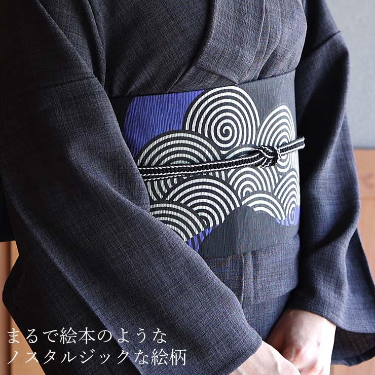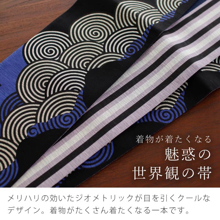 \BLACK FRIDAY開催中/[日本製] 細帯 半巾帯 紬風 波雲文様(黒×紺/950-2980-B)単品 両面OK リバーシブル ジオメトリック 渦巻き 円形 ストライプ 幾何 モダン クール 黒 薄紫 青 個性的 半幅帯 モダン お洒落 着物 きもの ブランド 召しませ花 (ma510)