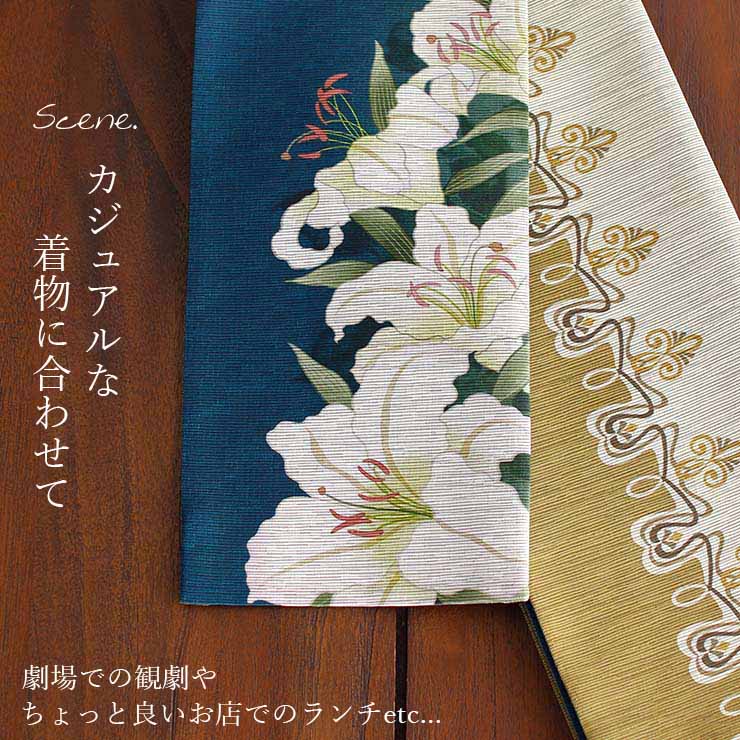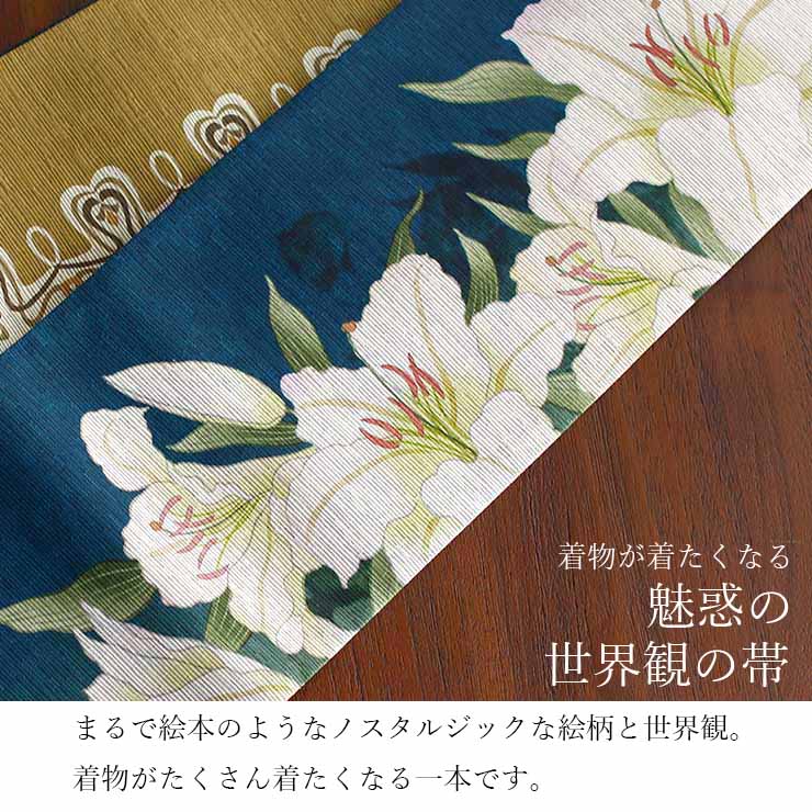 Color variation \大人気!召しませ花の帯が大集合!!/ 毎年大好評の召しませ花の細帯は種類も豊富!きっとお好みの帯が見つかるはずですよ〜! [関連カテゴリー] カジュアル 普段着 リボン 蝶結び 小春太鼓 文庫 貝の口 お太鼓 レディース 女性 婦人 変わり結び 簡単 レトロ モダン アレンジ 上品 華やか 大人 お正月 イベント 仕立て上がり お稽古 江戸小紋 色無地 紬 小紋 浴衣 [街着屋は「気ままに着物な和の生活」を応援します。] 和服 和小物 セレクトショップ 街着屋〜きもの遊び〜 は「普段着気分でキモノを楽しむ、気ままに着物な和の生活」を応援します。 撫松庵 召しませ花 岡重 嵐山よしむら 創世舎 などの 人気 呉服 和装ブランド をはじめ 着物 浴衣 訪問着 色無地 江戸小紋 のロングセラー着物や 袋帯 名古屋帯 半巾帯 立体裁断縫製 の 紙人形 長襦袢 草履 下駄 はもちろん 和装をより華やかに彩る 半衿 帯締め 帯揚げ など厳選し 髪飾り かんざし 和装バッグ や 便利アイテムの 着付け小物 などのオシャレな 和雑貨 まで 10代 20代 30代 40代 50代 60代 70代 80代 と幅広い年齢層の方にお楽しみいただけるような商品を販売からレンタルまで何でも取り揃えています。 [着物を着るイベントいろいろ] お宮参り 初宮参り 百日参り 百日祝い お食い初め 初正月 初節句 初誕生 紐落とし 七五三 753 入学式 卒業式 入園式 卒園式 成人式 結婚式 結納 還暦 古希 喜寿 傘寿 米寿 卒寿 白寿 紀寿 百寿 お葬式 葬儀 追悼式 など 子供 や 孫 から 娘 息子 母親 父親 祖父 祖母 まで 家族 親族 友人 大切な人の 祝い事 慶事 や 弔事 など 人生の ライフイベント に。礼装 正礼服 フォーマル 準礼装 準礼服 セミフォーマル や 略礼装 平服 インフォーマル まで様々な シーン に対応した商品を取り揃えております。 茶道 お茶 華道 お花 弓道 お琴 三味線 蛇味線 尺八 和楽器 雅楽 踊り 日本舞踊 舞 舞台 神楽 能 カラオケ 歌謡 など 様々な 習い事 や お稽古 の 衣裳 として。旅行 や 歌舞伎 宝塚 ミュージカル コンサート などの 観劇 、 散策 街歩き カフェめぐり 、デパート で ショッピング 買い物 などの お出かけ や 普段 日常 日頃 の ちょっとした おしゃれ を楽しむ 洒落着 としてもお楽しみいただけるような レトロ モダン で 粋 なアイテムも充実しております。 また 誕生日 の バースデープレゼント クリスマス バレンタイン ホワイトデー 桃の節句 お雛様 雛祭り 端午の節句 こどもの日 敬老の日 など イベント事 や 節目 、 祝祭 祝賀 祝宴 慶賀 吉事 などの お祝い の席や 内祝い などの 贈り物 として プレゼント や ギフト にもおすすめです。 [取り扱いブランド] 創世舎 tsuki to kame 紙人形 仕立て 撫松庵 召しませ花 召しませ華 嵐山よしむら 本場筑前 博多織 ViVi tsumori chisato ツモリチサト 花しおり 和風館 乙葉 九重×中村里砂 JAPAN STYLE×中村里砂 玉城ティナ×紅一点 つやび×雅姫 吉田沙保里×JAPAN STYLE 芸艸堂 岡重 JILLSTUART 龍村美術 NATURAL BEAUTY 榛原 Modern Antenna キスミス きもの道楽 渡敬 衿秀 き楽っく きらっく 高島ちぢみ 近江ちぢみ [取り扱いアイテム] 洗える 訪問着 付け下げ 留袖 黒留袖 色留袖 色無地 江戸小紋 浴衣 ゆかた 小紋 ブランド着物 ふりそで 振袖セット 袴セット はかま 長襦袢 肌襦袢 半襦袢 ローズカラー うそつき襦袢 和装肌着 ステテコ 裾よけ ズロース 補整下着 袋帯 名古屋帯 半巾帯 細帯 小袋帯 兵児帯 帯リボン 角帯 作り帯 大島紬 結城紬 絣 草履 ぞうり 下駄 時雨履き 雪駄 雪踏 足袋 手袋 たとう紙 腰紐 伊達締め 帯締め 帯〆 帯揚げ 半衿 伊達衿 重ね衿 三分紐 四分紐 帯留め 帯飾り 前板 帯板 帯枕 きものクリップ コーリンベルト 風呂敷 マスク 和装バッグ 巾着 信玄袋 財布 和雑貨 扇子 末広 扇 髪飾り ヘアー小物 日傘 名刺入れ 晒 ハンカチ 手拭い 正座椅子 暖簾 お初着 一つ身 三つ身 四つ身 被布 着物 kimono きもの 和服 わふく 呉服 五福 ごふく 着るもの 衣服 衣類 袷 単衣 夏着物 絽きもの 羽織 はおり 道中着 道行 長羽織 コート ケープ ショール ポンチョ カッパ 合羽 雨コート ちりめん 東レ シルック 絹 シルク 綿 コットン 羊毛 ウール ポリエステル アンゴラ ベルベット深みのある色彩とノスタルジックな世界観。 心惹かれる、おしゃれな大人の半巾帯 半幅帯 カサブランカ(深青) 「着物を着たくなる着物」をコンセプトにした 「召しませ花」シリーズ。 本当に着物を着たい!と思えるような、心ときめく世界観が広がる半巾帯です。 着物が着たくなる。想像力が掻き立てられる魅惑のデザイン。 美しい大輪のカサブランカの花が目を惹きます。どこかノスタルジーを感じさせる独特の世界観が魅力的。思わず自慢したくなるほど可愛いデザインです。 深青地でシックな色合い。カジュアルな普段のお着物にぴったりデザインです。 カジュアルな着物に合わせて。キモノを楽しむ帯。 カジュアルシーンの気分を盛り上げる、魅力的な半巾帯です。絵本のようなノスタルジックなデザインに、こっくりと深みのある色彩と味わい