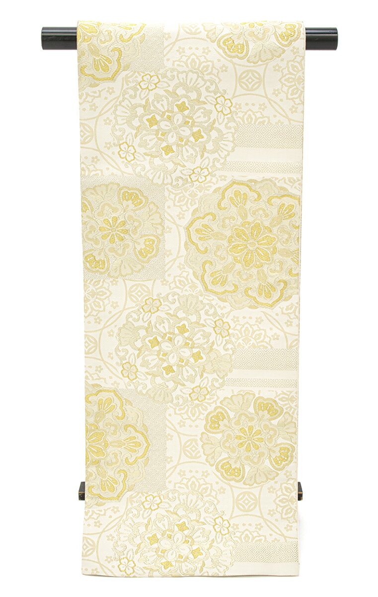 袋帯 訪問着 礼装 正装 金 ゴールド クリーム ベージュ 銀 市松 唐花 花 全通柄 小杉織物謹製 女性用 レディース 仕立て上がり日本製 送料無料