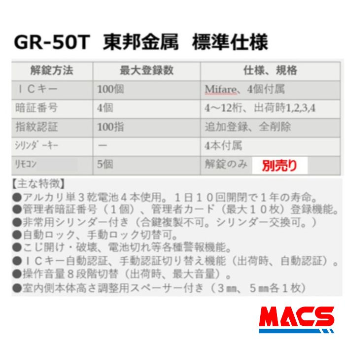 GR-50T リモコン無し ACS-BH2 セット販売 室内機横型 マルチ解錠電子錠 (指紋,非常キー,暗証番号,ICキー,リモコン) サービス満載! 東邦金属 TOHO