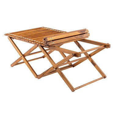 ●小さく収納・持ち運びが簡単なロールトップテーブル。チーク材と本革の風合いはインテリアとしても最適。 ●ロール天板のつなぎ目には贅沢に本革を使用。デザインとしてもオシャレなアクセントに。 ●工具不要で、フレームを広げ補強バーを取り付け天板を設置するだけの簡単組立式。 ●天板をくるくると丸める事ができるロールトップ式なので、折りたたんでコンパクトに収納。 ●アウトドア・レジャー・キャンプや運動会等のイベント、お庭でのバーベキューなど幅広く活躍。