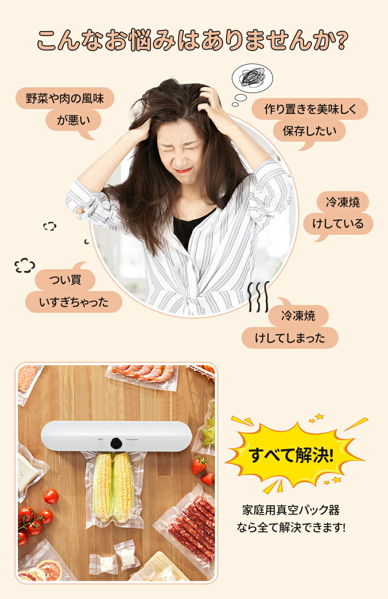 アイテム情報 商品仕様 商品名:真空パック機 サイズ:横幅35×奥行7.2×高さ6cm 真空性能:(乾)-35Kpa/(湿)-60Kpa 最大消費電力:120W 最大密閉口:28cm 密閉幅:3mm 商品ポイント 乾湿兼用で使用可能 乾燥したものから水分の多いものまで真空&密閉することが可能です。 食品を新鮮なまま保存 しっかり真空&密閉して空気に触れさせないのて食品を新鮮なまま保存することが可能 保存期間が長くなり食品が長持ち! 3mm幅でしっかり密閉 一般的な密閉幅より太めの高耐久熱線幅3mmシーラーを採用漏れなどが少なくしっかり密閉できます。 28cmの幅広ワイヤー 一般的な商品に比ベて横幅が広い28cmの発熱ワイヤーを採用し、多パッケージ食材を同時に処理することができ、効率UP! ワンタッチで簡単操作 1.両側のボタンを押してフタを開ける 2.袋をセットする。 3.フタを閉めると「カチっ」という音が鳴りロックされる 4.Seal itボタンを押しと密閉機能だけです。 Vacuum Sealボタンを押しと真空&密閉機能を作動します。 真空袋10枚付き/専用袋不要 真空袋10枚付きます! もう割高な専用袋は必要ありません。市販のナイロンボリ袋及、びアルミ 蒸着袋を使用することが可能です! メーカー希望小売価格はメーカー商品タグに基づいて掲載しています。 注意事項 ※薄い袋は気密性が低く、外部の空気が徐々に侵入しますので、素材のバリア性能が不十分(ナイロン/PEの多層構造が必要)、推奨厚さ0.08mm以上の袋を使用ください(薄い袋は物理的に真空維持不可)。※両面に凹凸加工があるもの、または片面平滑・片面凹凸のものはどちらも使用可能です。(両面とも平滑な袋は封口専用で、真空吸引はできません。)関連商品はこちら 真空食品袋 保鮮袋1,480円 キッズテント 子供 組立て簡単3,680円 LEDクリップライト 調光調色1,980円 led イルミネーション30球 自動点灯1,980円 LED イルミネーション 30球 /100球 ソーラー充電1,980円