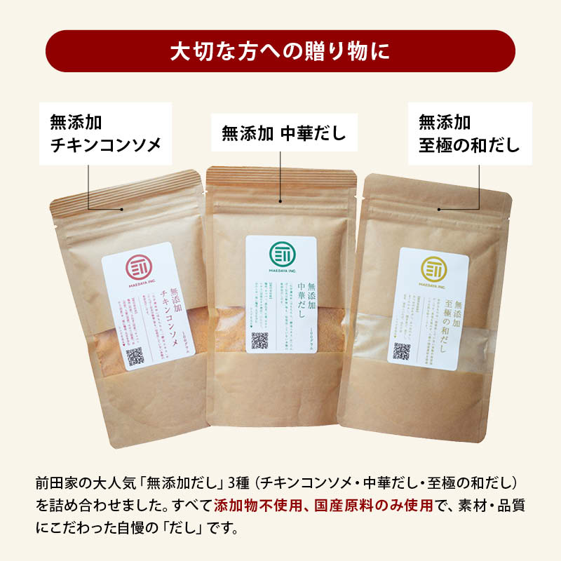 【セール限定 10%OFFクーポン有】前田家 無添加 だし ギフト 3種詰合せ 各100g 粉末 チキンコンソメ 中華だし 至極の和だし セット 国産 無塩 化学調味料不使用 グルテンフリー 内祝 お歳暮 御歳暮 ギフト 冬ギフト 熨斗無料