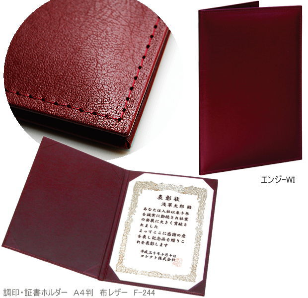 調印 証書ホルダー 賞状ファイル A4 布レザー製 高級感 合皮 2枚収納 コレクト F-244 表彰式 卒業証書 契約書 許可証 名前入れ