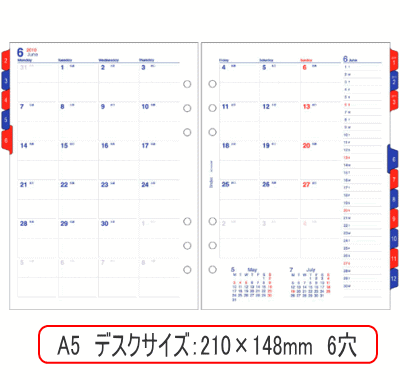 システム手帳リフィル 2026年 A5サイズ 6穴 月間ダイアリー5 ブロックタイプ デスクサイズ バインデックス A5-056