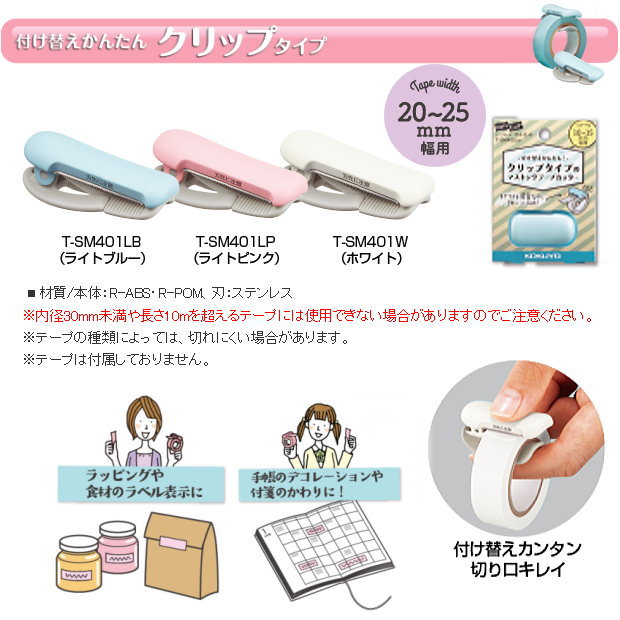 取り付け簡単 クリップタイプのカルカット 軽い力でまっすぐ切れるテープカッター「カルカット」にクリップタイプが登場。マスキングテープのカットにおすすめです。 品名 テープカッター カルカット クリップタイプ テープ幅:20-25mm用 Karu Cut 品番 T-SM401LB ライトブルー/ T-SM401LP ライトピンク/ T-SM401W ホワイト サイズ W40×D20×H20mm 約9g 仕様 対応テープ: 幅20〜25mm ※小巻きテープ専用 材質 本体:R-ABS・R-POM、刃:ステンレス メーカー コクヨ KOKUYO ※内径30mm未満や長さ10mを超えるテープには使用できない場合があります。 ※テープの種類によっては、切れにくい場合があります。 ※テープは付属しておりません。 ※他のモール及び店頭売りと在庫を併用しておりますのでご注文後でも在庫切れの場合がございますのであらかじめご了承下さい。 【関連商品】 Bizrack up バッグインバッグ A4横 Bizrack up バッグインバッグ A4縦 Bizrack up バッグインバッグ A5 Bizrack up バッグインバッグ A6 自立するトレータイプのバッグインバッグA4 縦 自立するトレータイプのバッグインバッグA4 コンパクトホッチキス スラリ 人気の多機能ペン 木軸のコンパクトなシャープペン ミニ カルカット クリップタイプ テープ幅10〜15mm 厚みを測れる定規 2Wayハサミ ハコアケ