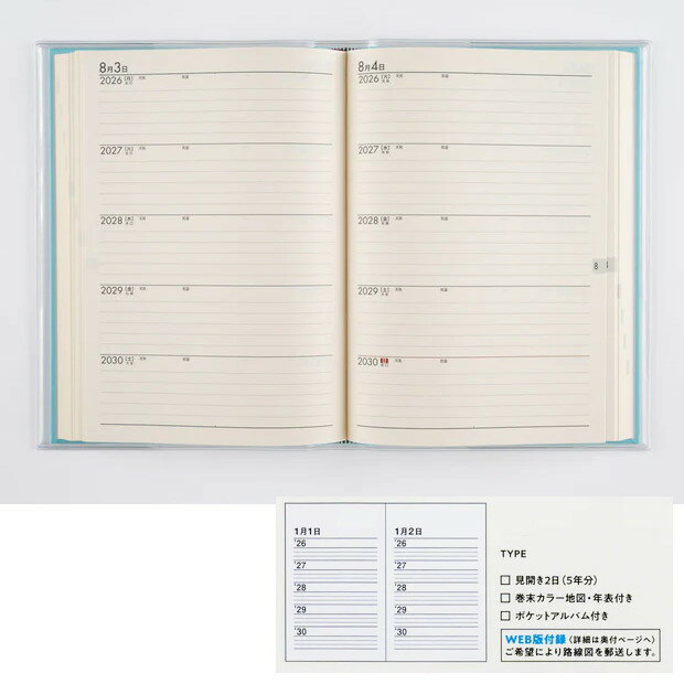 5年横線当用新日記 (品番 No.22) サイズ 約)縦216×横153 背幅24mm 約)685g 用紙サイズ:A5判(210×148mm) 2026年1月始まり日付入、透明ビニールカバー、432頁 ヨコ書き・1ページ1日5年分(各種行事や記念日のほか、旧暦も掲載) 掲載期間 日付頁記載欄:2026年1月1日〜2030年12月31日 メーカー (株)高橋書店 ※店頭及び他のモールと在庫を共有しておりますので、掲載中の商品でも欠品の 場合がございますのであらかじめご了承ください。 お急ぎの場合はメールで在庫の問い合わせをお願い致します。5年間の記録を一目で比較!シンプルなA5連用日記帳 「日々の出来事や記録を5年間分比較したい、シンプルで明るい紙面の連用ダイアリーが欲しい」 この高橋書店 5年横線当用新日記は、2026年〜2030年の5年間に対応した、 シンプルな装丁と明るい紙面が特徴のA5サイズの五年日記です。 【3つの魅力】 1. 5年間の記録を一目で比較 1ページ1日5年分のヨコ書き形式で、毎年同じ日の記録を並べて見ることができます。 日々の変化や成長を実感できる長期記録に最適です。 2. シンプルで使いやすい仕様 2026年1月始まり日付入りなので、令和7年1月始まりとしてすぐに使えます。 各種行事や記念日のほか、旧暦も掲載されており、生活に役立ちます。 3. 丈夫で安心のカバー 透明ビニールカバーが付いているため、汚れや水濡れから表紙を守り、 5年間の長期保存をサポートします。 【この商品がおすすめな方】 5年連用で日記をつけたい方、長期的な記録を残したい方。 高橋書店の定番である横線当用新日記を求めている方。 A5サイズの日付入りで、ネコポス便対応(※規定サイズ内)のシンプルなダイアリーを探している方。 【商品情報】 項目 詳細 商品名 5年横線当用新日記 品番 No.22 メーカー (株)高橋書店 掲載期間 2026年1月1日〜2030年12月31日(5年間) サイズ A5判(縦216×横153mm、432頁) 仕様 5年連用、ヨコ書き、1ページ1日5年分、日付入り、透明ビニールカバー 特徴 各種行事や旧暦も掲載、シンプルな装丁、ライトブルー表紙