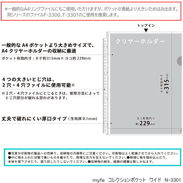 推し活をもっと楽しく myfa ミファ 様々な推し活グッズに対応可能なクリヤーポケットです。A4クリヤーホルダー収納に最適 商品名 myfa ミファ コレクションポケットワイド 品番 N-3301 サイズ 縦317×横247mm ポケット有効内寸:縦315×横229mm※一般的なA4リングファイルにもご使用いただけますが、ポケットが表紙より大きいためはみ出ます。 仕様 10枚入 ※A4-Sタイプ 30穴・2穴・4穴ファイルに対応 トップインタイプ。 素材 ポリプロピレン(生地厚0.1mm) メーカー LIHIT LAB. 株式会社 リヒトラブ myfa ミファ コレクションファイル F-3300/F-3301 にお使いいただけます。 ※店頭及び他のモールと在庫を共有しておりますので、掲載中の商品でも欠品の場合がございますのであらかじめご了承ください。お急ぎの場合はメールで在庫の問い合わせをお願い致します。