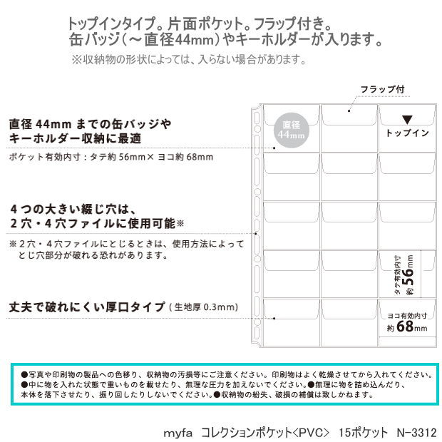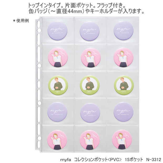 推し活をもっと楽しく myfa ミファ 様々な推し活グッズに対応可能なクリヤーポケットです。 商品名 myfa ミファ コレクションポケット<PVC> 15ポケット 品番 N-3312 サイズ 縦302×横230mm ポケット有効内寸:縦56×横68mm 仕様 2枚入 ※A4-Sタイプ 30穴・2穴・4穴ファイルに対応 トップインタイプ。片面ポケット。フラップ付き。 缶バッジ(〜直径44mm)やキーホルダーが入ります。 ※収納物の形状によっては、入らない場合があります。 素材 PVC(生地厚0.3mm) メーカー LIHIT LAB. 株式会社 リヒトラブ myfa ミファ コレクションファイル F-3300/F-3301 にお使いいただけます。 ※店頭及び他のモールと在庫を共有しておりますので、掲載中の商品でも欠品の場合がございますのであらかじめご了承ください。お急ぎの場合はメールで在庫の問い合わせをお願い致します。