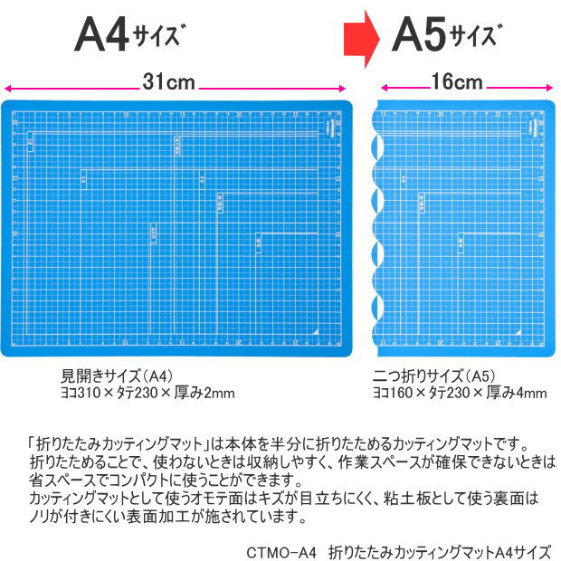 環境に配慮した「オレフィン系樹脂」を使用。 持ち運びに便利でカラフルな折りたたみカッティングマット。 品名 折りたたみカッティングマットA4サイズ 品番 CTMO-A4 サイズ (見開きサイズA4)ヨコ310×タテ230×厚み2mm 重さ:130g/ (二つ折りサイズA5)ヨコ160×タテ230×厚み4mm 仕様 5mm方眼入り/環境に配慮したオレフィン系樹脂製/日本製 メーカー ナカバヤシ株式会社 ※他のモール及び店頭売りと在庫を併用しておりますのでご注文後でも在庫切れの場合がございますのであらかじめご了承下さい。