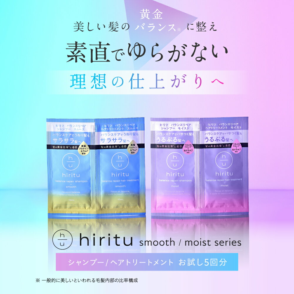 【楽天スーパーSALE期間限定5%OFFクーポン対象】 hiritu(ヒリツ) バランスリペア 5Daysトライアル モイスト スムース パサつきケア うねりケア PPT系洗浄成分 アミノ酸系洗浄成分 毛髪補修成分 ヒートケア成分 アプリコット&ジャスミンの香り ペアー&ムスク
