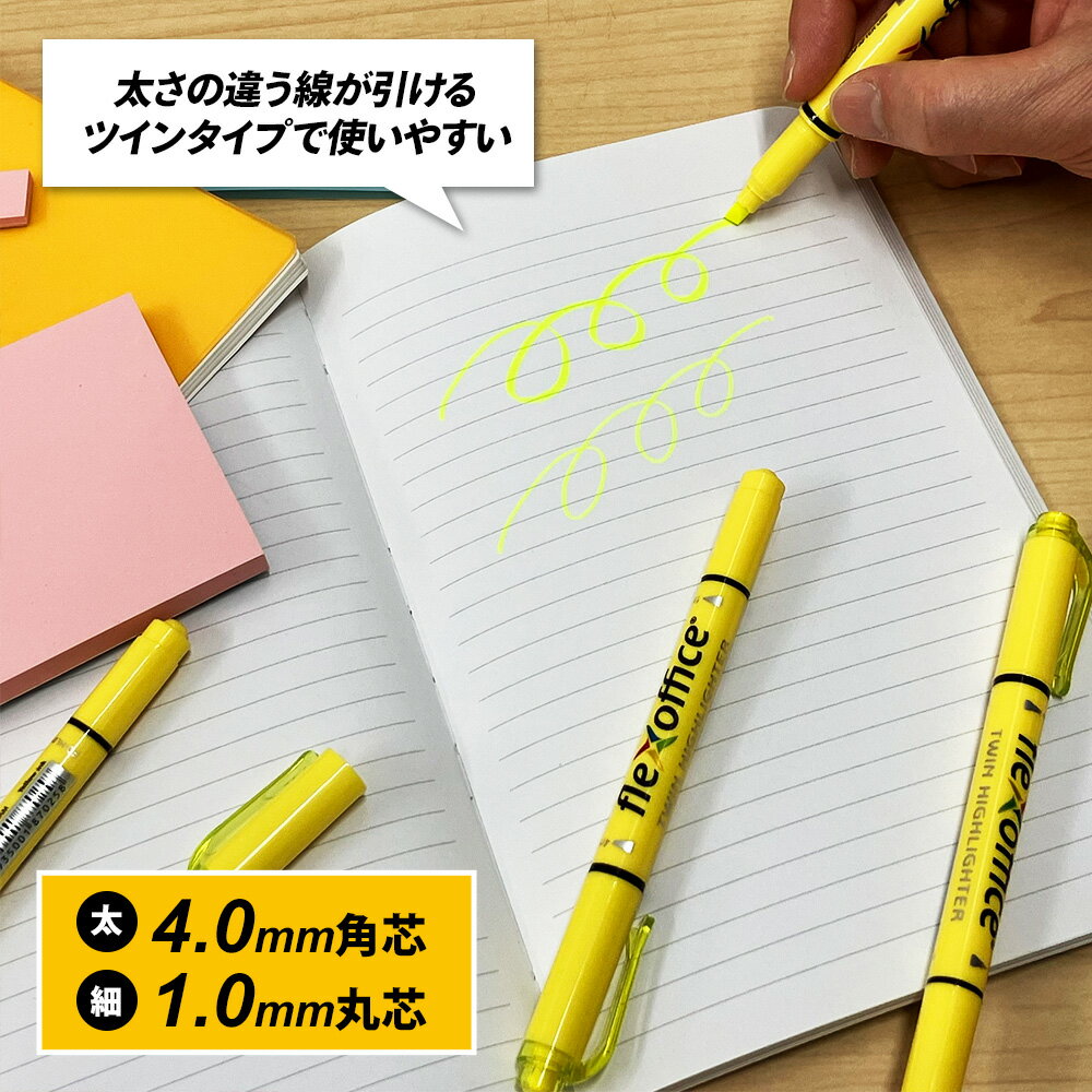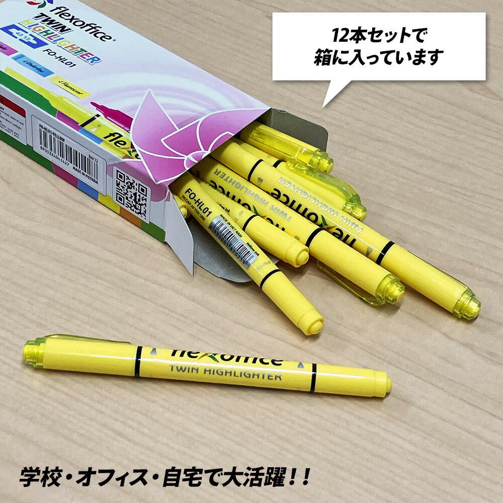 flexoffice 蛍光ペン/蛍光マーカー 12本セット イエロー/黄 ツインタイプ 1.0mm/4.0mm 速乾 にじまない 学校用・オフィス用