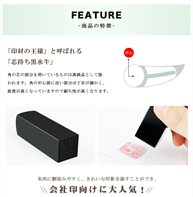黒水牛印鑑 【送料無料】 【10年保証】 ベトナムに生息する水牛の角。芯持極上材。 ●印鑑サイズ 21mm角×長さ60mm(法人角おすすめ) 24mm角×長さ60mm(法人角おすすめ) ●配送方法 この商品は、無料ネコポスにて発送いたします。 ●保証 お客様が当店にてお買い上げいただいた印鑑は、ご購入日より、10年以内であれば、無料で彫り直しをいたします。(送料は往復分ご負担ください。)
