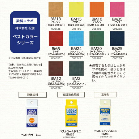 1本でTシャツ1枚分 布約125g染まる液体染料。計量なしの使い切りサイズ! 飛散や溶け残りによるムラ染めもありません。液体なので、ムラ染めがなく、色の調合が簡単です。煮沸染めなので、しっかりとした染色をご希望の方におすすめです。 ■種類:煮沸染料(BESTCOLOR ベストカラーシリーズ) ■適する素材:綿 麻 レーヨン ■一個あたりで染められる布の重さ:125g Tシャツ1枚分 ※洗濯堅牢度の向上(色の定着)には、別売りのベストフィックスをご使用ください 。 ※加熱設備がない場合は、別売りのベストコールド(低温染色助剤)を加えて、水染め染色をご利用ください。