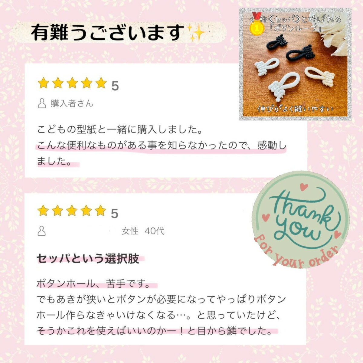 セッパ ボタンループ ループ ボタン ボタンホール | クロ (大)5個入り ボタンホールが苦手な方や省略したい方におすすめ 〇クロ(大)が5個入り〇大きさ 約10mm×約20mm※15〜18mm程度のボタンに適しています(種類によって20mmも対応可能)〇素材 ナイロン100%〇商品説明縫い代にはさみこむ事で簡単にボタンループを作る事が出来る「セッパ」という商品です。ヘアゴムのように中にゴムは入っていません。伸びもよく柔らかい為、ミシンでの取り扱いに最適です。また、縫い代がしっかりとありますので、着脱を繰り返すうちにゴムが抜け落ちてしまう事もありません。既製品のような仕上がりを目指す方に。ボタンホールの手間を省いて早く綺麗に仕上げたい方に。初心者の方にも優しいオススメのボタンループです☆※縫い付ける前に必ずボタンを通して入るかどうかのチェックをして下さい。 縫い代をとりすぎるとボタン通らない事がありますのでご注意ください。※直射日光を避けて保管してください(変色の原因となります)※素材感や色目はそれぞれ実物に近くなるよう撮影には配慮しておりますが、お使いのOS環境によっては表現が難しい場合もございますので予めご了承ください。〇その他セッパはこちら ↓↓↓〇洗濯ラベルはこちら ↓↓↓〇サイズタグはこちら ↓↓↓ 2